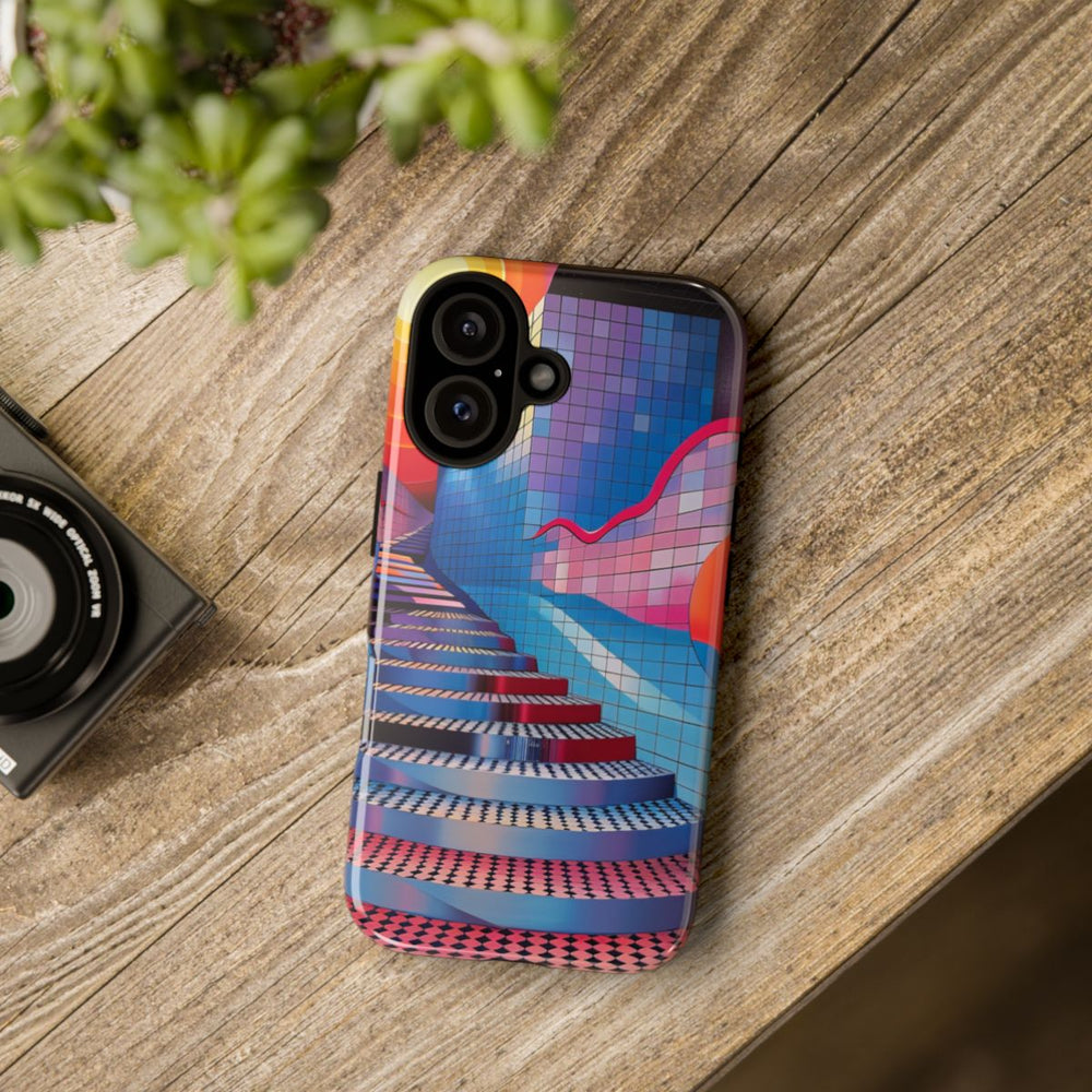 Dit ontwerp toont een opvallende trap die omhoog loopt door een levendige, betegelde gang. De wanden zijn bedekt met een raster van kleine vierkanten in tinten blauw, paars en roze, met twee ronde uitsparingen die contrasterende kleuren en texturen laten zien. Boven de trap straalt een grote, lichtgevende zonvorm warme tinten oranje, geel en rood uit, wat zorgt voor een krachtig contrast met de koelere kleuren eronder. De treden zijn voorzien van een geblokt patroon dat van roze naar blauw verloopt, wat de surrealistische en abstracte sfeer versterkt. Het hoesje is glanzend afgewerkt, stevig en gemaakt van duurzaam polycarbonaat met een TPU-voering. Het biedt optimale bescherming en is geschikt voor draadloos opladen.