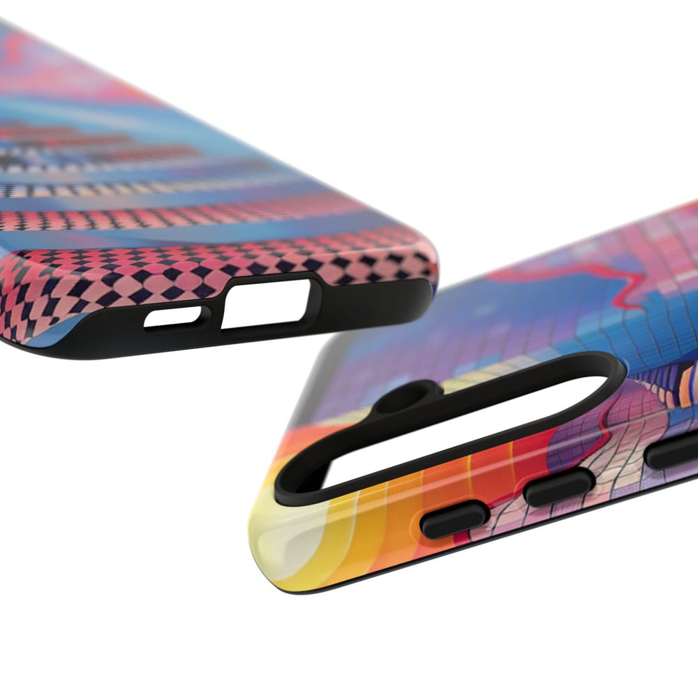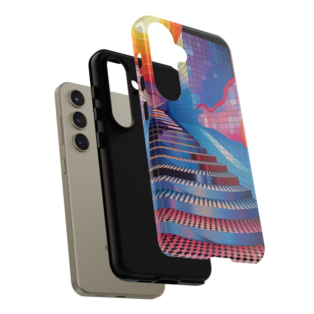 Dit ontwerp toont een opvallende trap die omhoog loopt door een levendige, betegelde gang. De wanden zijn bedekt met een raster van kleine vierkanten in tinten blauw, paars en roze, met twee ronde uitsparingen die contrasterende kleuren en texturen laten zien. Boven de trap straalt een grote, lichtgevende zonvorm warme tinten oranje, geel en rood uit, wat zorgt voor een krachtig contrast met de koelere kleuren eronder. De treden zijn voorzien van een geblokt patroon dat van roze naar blauw verloopt, wat de surrealistische en abstracte sfeer versterkt. Het hoesje is glanzend afgewerkt, stevig en gemaakt van duurzaam polycarbonaat met een TPU-voering. Het biedt optimale bescherming en is geschikt voor draadloos opladen.