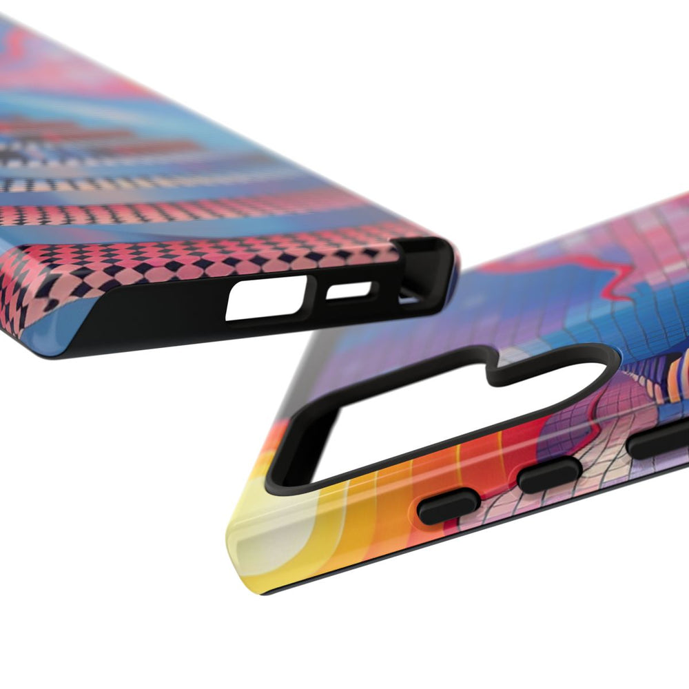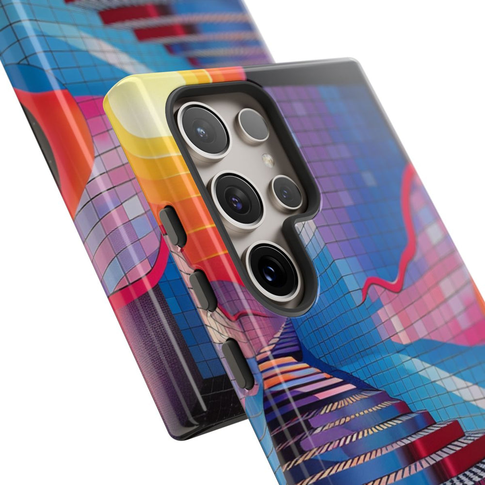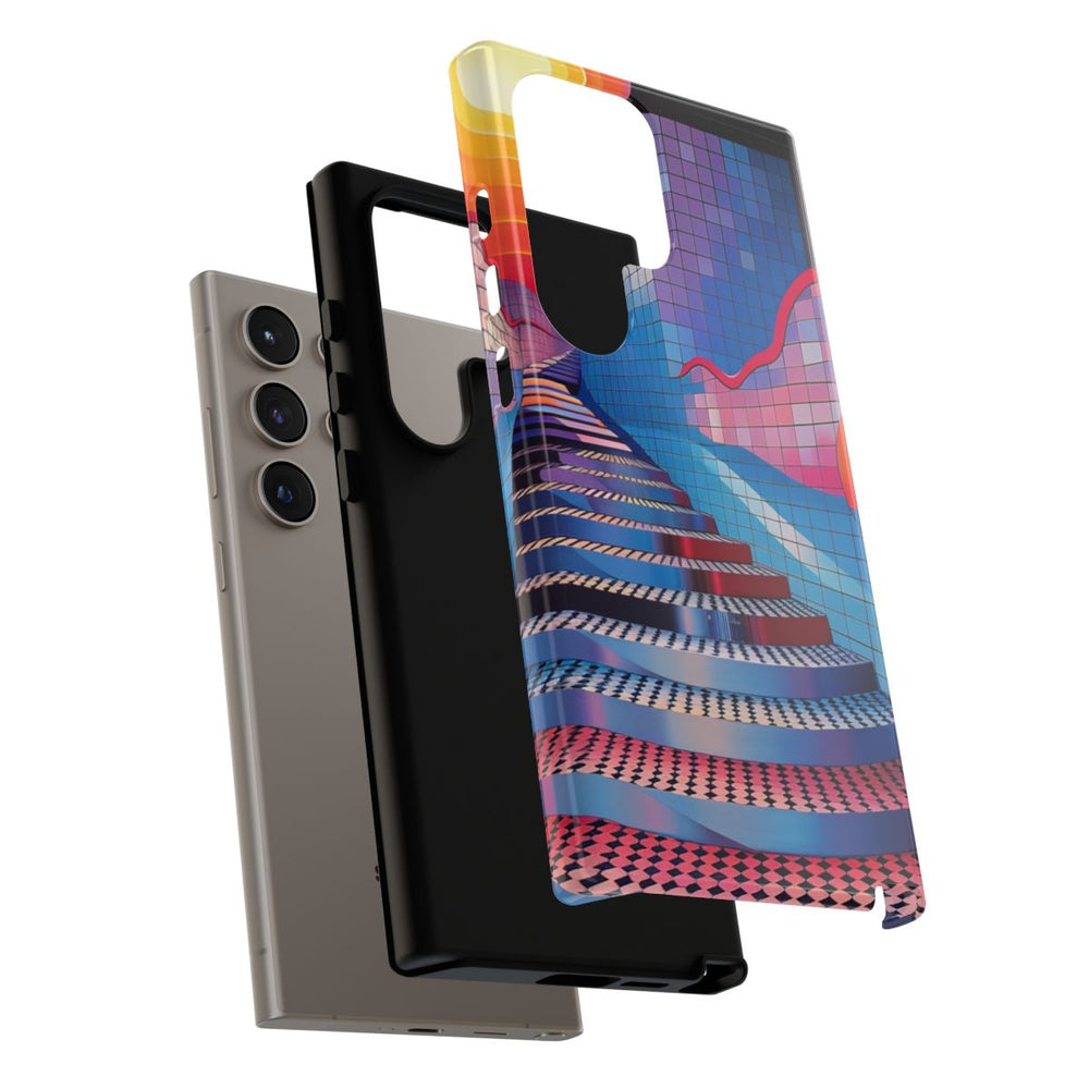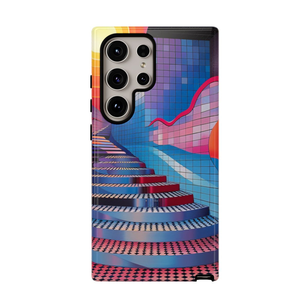 Dit ontwerp toont een opvallende trap die omhoog loopt door een levendige, betegelde gang. De wanden zijn bedekt met een raster van kleine vierkanten in tinten blauw, paars en roze, met twee ronde uitsparingen die contrasterende kleuren en texturen laten zien. Boven de trap straalt een grote, lichtgevende zonvorm warme tinten oranje, geel en rood uit, wat zorgt voor een krachtig contrast met de koelere kleuren eronder. De treden zijn voorzien van een geblokt patroon dat van roze naar blauw verloopt, wat de surrealistische en abstracte sfeer versterkt. Het hoesje is glanzend afgewerkt, stevig en gemaakt van duurzaam polycarbonaat met een TPU-voering. Het biedt optimale bescherming en is geschikt voor draadloos opladen.