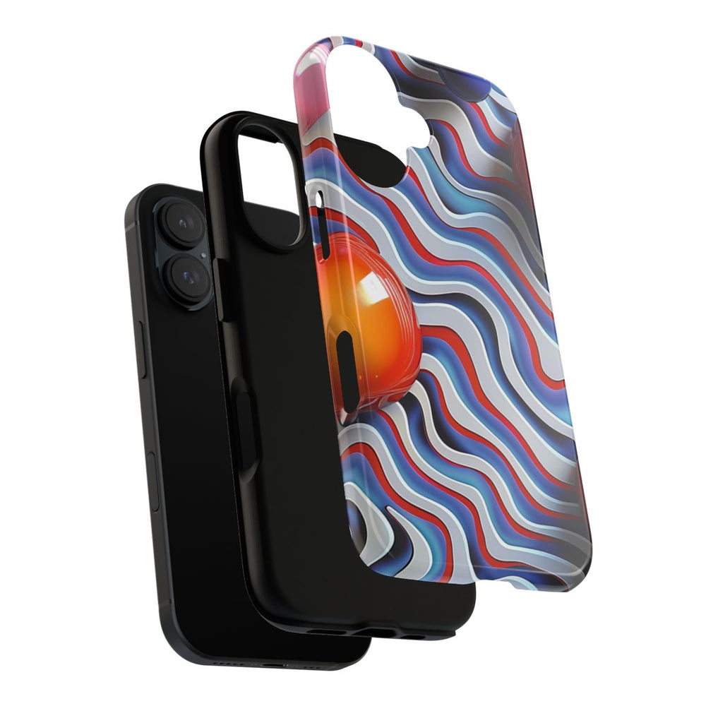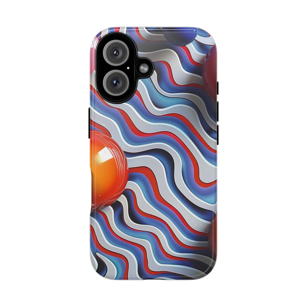Dit hoesje heeft een levendig patroon van golvende lijnen in blauw, rood, zwart en wit, wat zorgt voor een speelse en abstracte achtergrond. Over het oppervlak verspreid vind je glanzende, reflecterende bollen in opvallende tinten roze, oranje en blauw. De bollen verschillen in grootte en lijken boven de golvende lijnen te zweven, wat diepte en contrast geeft aan het ontwerp. Het hoesje is vervaardigd uit polycarbonaat en TPU en biedt stevige, dubbele bescherming. Geschikt voor draadloos opladen.