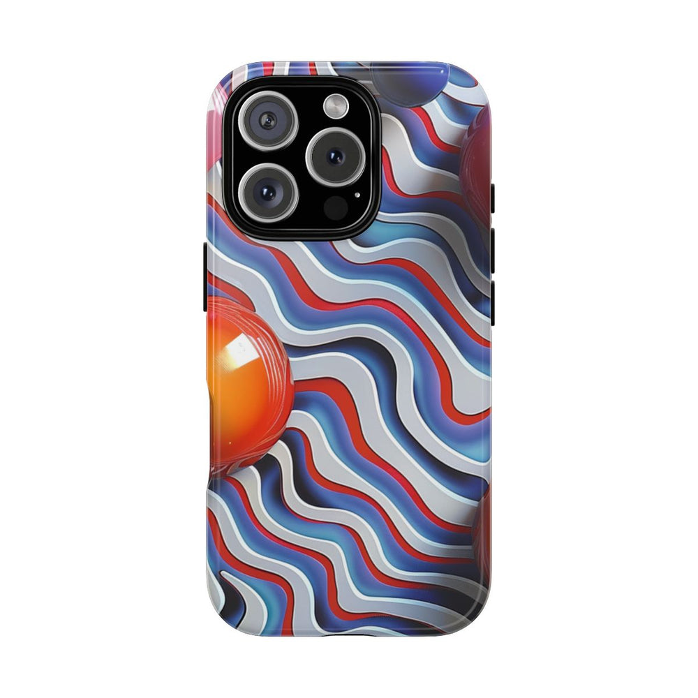 Dit hoesje heeft een levendig patroon van golvende lijnen in blauw, rood, zwart en wit, wat zorgt voor een speelse en abstracte achtergrond. Over het oppervlak verspreid vind je glanzende, reflecterende bollen in opvallende tinten roze, oranje en blauw. De bollen verschillen in grootte en lijken boven de golvende lijnen te zweven, wat diepte en contrast geeft aan het ontwerp. Het hoesje is vervaardigd uit polycarbonaat en TPU en biedt stevige, dubbele bescherming. Geschikt voor draadloos opladen.