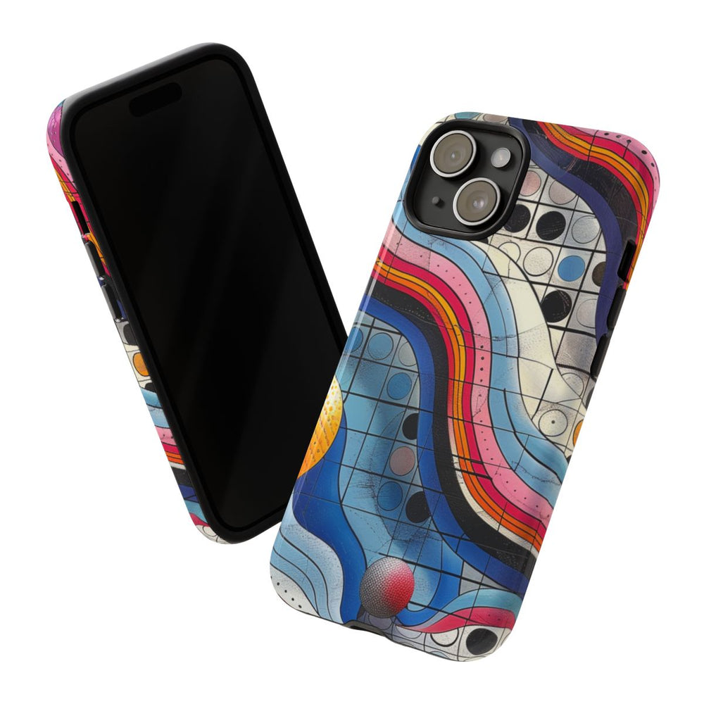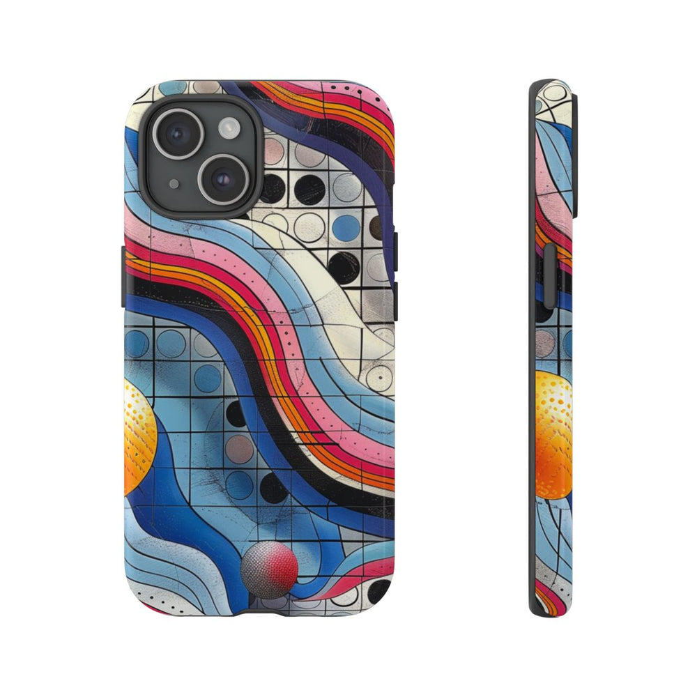 Dit telefoonhoesje heeft een levendig abstract patroon met golvende strepen in roze, blauw, oranje, zwart en wit die over een raster met cirkels in verschillende kleuren, zoals zwart, blauw en beige, lopen. Verschillende bolvormige elementen in oranje, roze en grijs zorgen voor extra diepte en contrast. Het patroon is gedetailleerd en geometrisch, wat zorgt voor een dynamisch visueel effect. Het hoesje is glanzend en stevig, gemaakt van duurzaam polycarbonaat met een TPU-voering. Geschikt voor draadloos opladen en bestand tegen diverse weersomstandigheden.