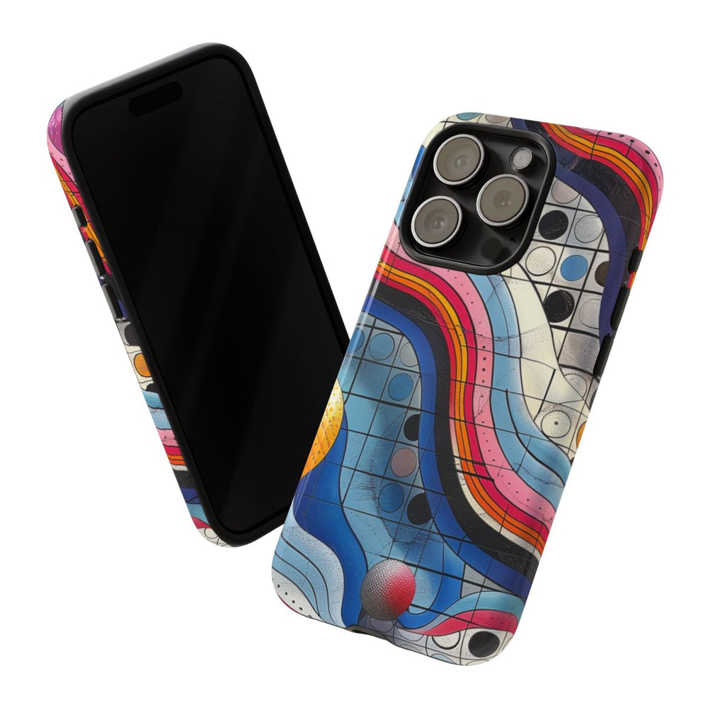 Dit telefoonhoesje heeft een levendig abstract patroon met golvende strepen in roze, blauw, oranje, zwart en wit die over een raster met cirkels in verschillende kleuren, zoals zwart, blauw en beige, lopen. Verschillende bolvormige elementen in oranje, roze en grijs zorgen voor extra diepte en contrast. Het patroon is gedetailleerd en geometrisch, wat zorgt voor een dynamisch visueel effect. Het hoesje is glanzend en stevig, gemaakt van duurzaam polycarbonaat met een TPU-voering. Geschikt voor draadloos opladen en bestand tegen diverse weersomstandigheden.