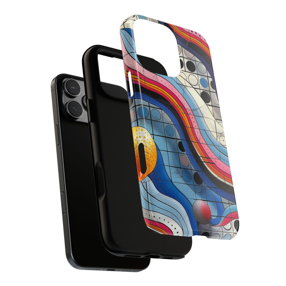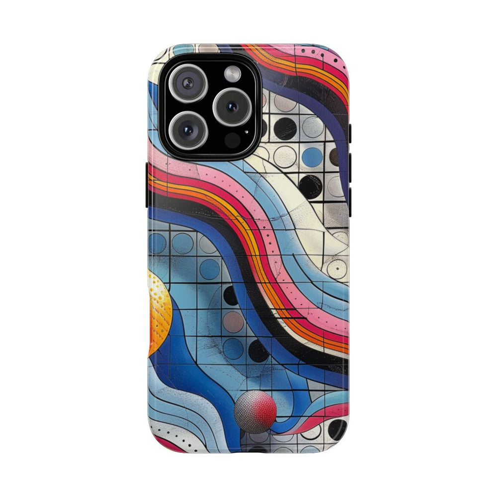 Dit telefoonhoesje heeft een levendig abstract patroon met golvende strepen in roze, blauw, oranje, zwart en wit die over een raster met cirkels in verschillende kleuren, zoals zwart, blauw en beige, lopen. Verschillende bolvormige elementen in oranje, roze en grijs zorgen voor extra diepte en contrast. Het patroon is gedetailleerd en geometrisch, wat zorgt voor een dynamisch visueel effect. Het hoesje is glanzend en stevig, gemaakt van duurzaam polycarbonaat met een TPU-voering. Geschikt voor draadloos opladen en bestand tegen diverse weersomstandigheden.