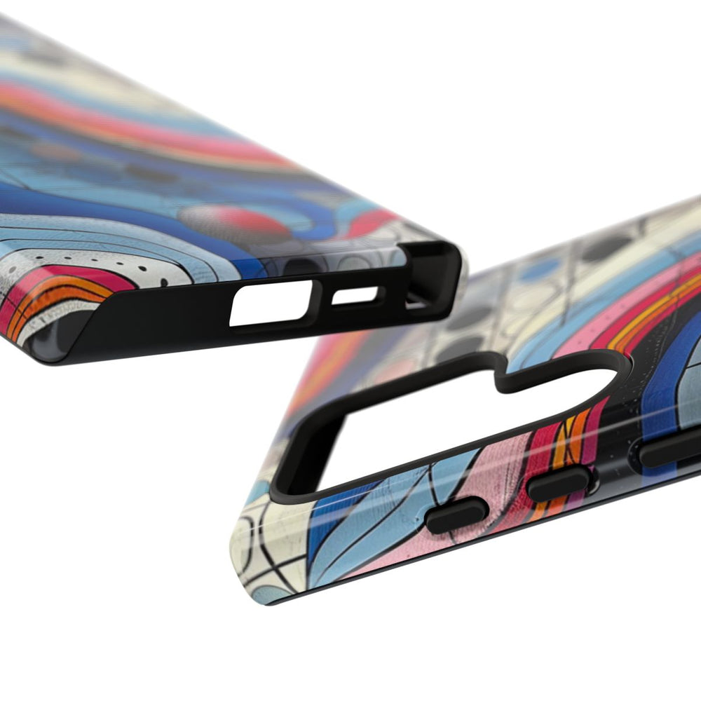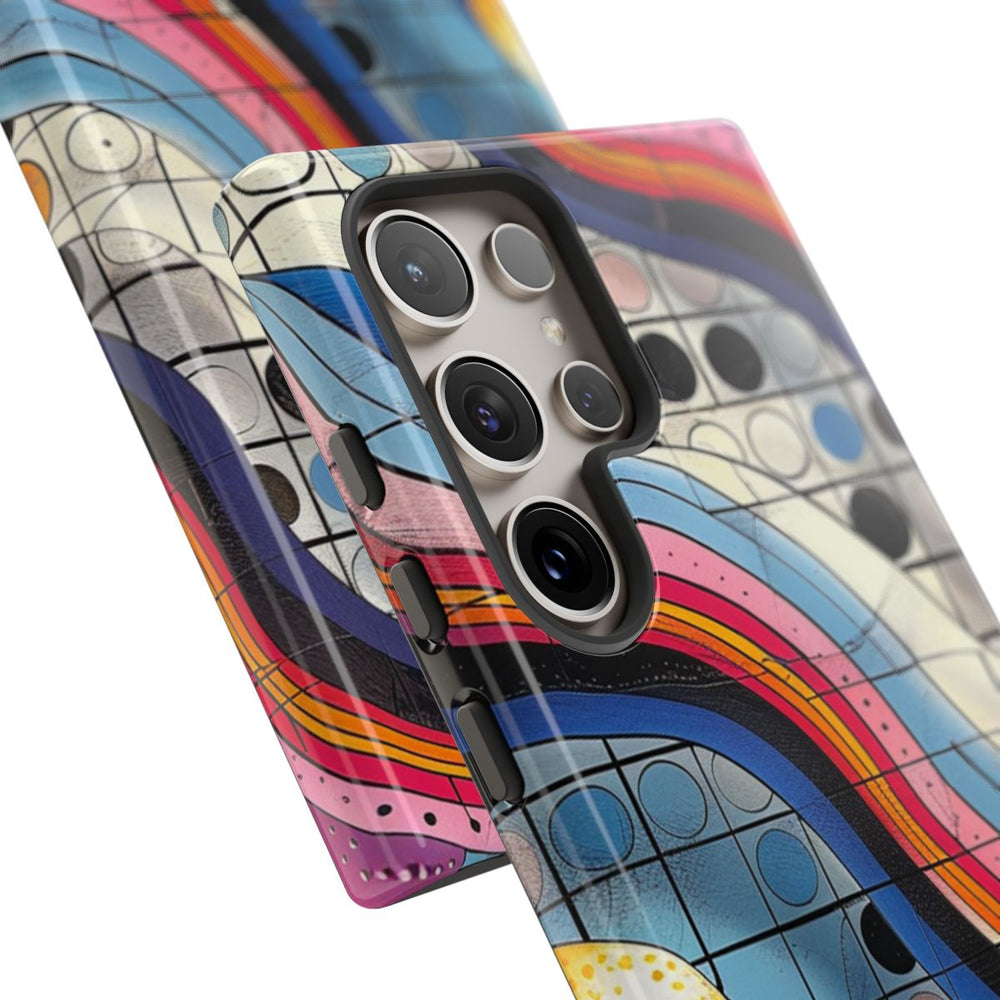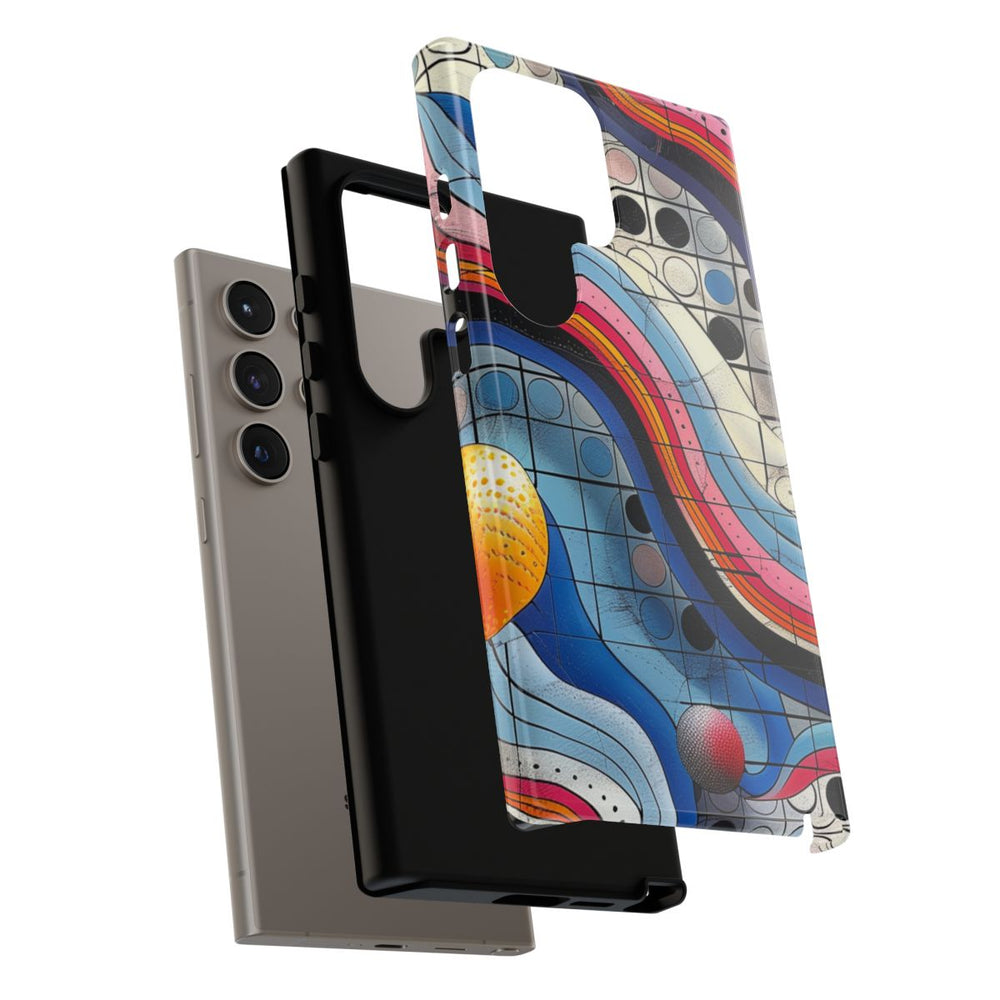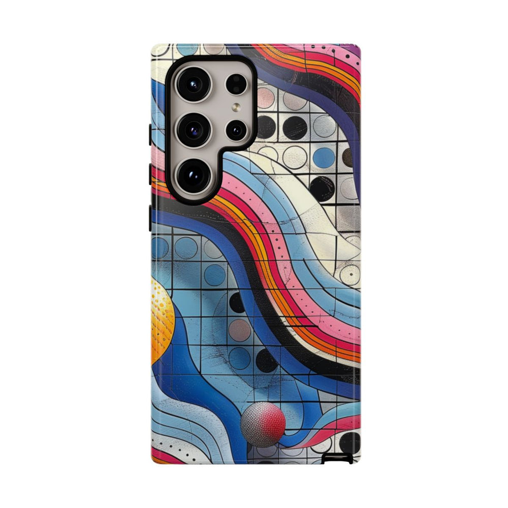 Dit telefoonhoesje heeft een levendig abstract patroon met golvende strepen in roze, blauw, oranje, zwart en wit die over een raster met cirkels in verschillende kleuren, zoals zwart, blauw en beige, lopen. Verschillende bolvormige elementen in oranje, roze en grijs zorgen voor extra diepte en contrast. Het patroon is gedetailleerd en geometrisch, wat zorgt voor een dynamisch visueel effect. Het hoesje is glanzend en stevig, gemaakt van duurzaam polycarbonaat met een TPU-voering. Geschikt voor draadloos opladen en bestand tegen diverse weersomstandigheden.