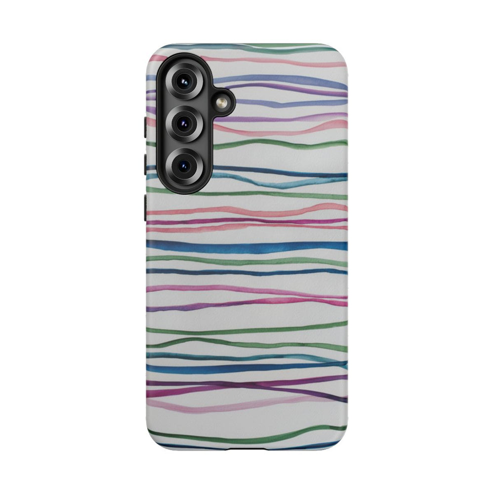 Dit hoesje is versierd met meerdere horizontale strepen in waterverf, uitgevoerd in diverse kleuren zoals groen, blauw, roze, paars en teal. De strepen zijn ongelijk en golvend, wat zorgt voor een speelse en artistieke uitstraling op een witte achtergrond. Het matte hoesje heeft een stevige buitenkant van polycarbonaat en een binnenzijde van TPU, waardoor het extra duurzaam is en optimale bescherming biedt. Het hoesje ondersteunt draadloos opladen en is bestand tegen invloeden van buitenaf.