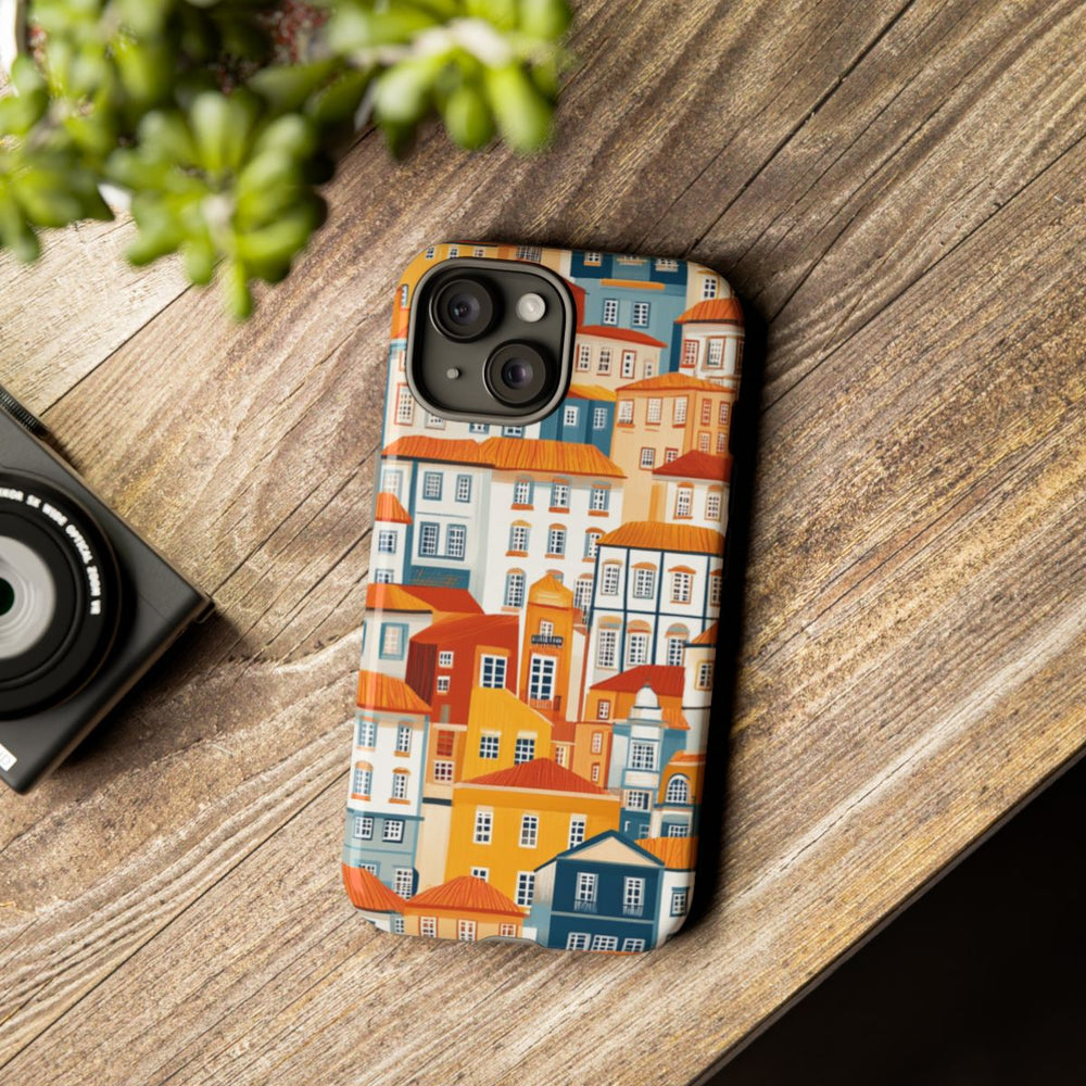 Dit hoesje is bedrukt met een naadloos patroon van vrolijke, kleurrijke huisjes met oranje daken en muren in blauw, wit en beige tinten. De huisjes staan dicht op elkaar, wat zorgt voor een levendige en gezellige stadsuitstraling. Het hoesje heeft een glanzende afwerking en is stevig uitgevoerd dankzij de dubbele laag van een polycarbonaat buitenkant en TPU binnenzijde voor extra bescherming. Ondersteunt draadloos opladen en is bestand tegen weersinvloeden, zodat de kleuren langdurig mooi blijven.