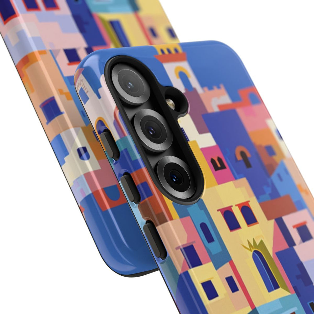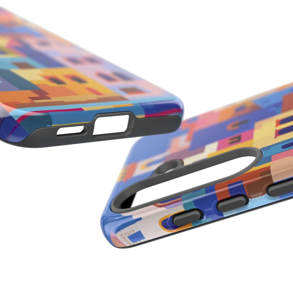 Dit ontwerp toont een levendige en kleurrijke illustratie van een kuststad met gestapelde gebouwen in verschillende geometrische vormen en heldere kleuren zoals blauw, geel, rood en paars. De afbeelding bevat architectonische details als bogen, ramen, koepels en kruisen op sommige gebouwen. Op de voorgrond drijft een klein bootje op rustig water en aan de hemel straalt een volle maan in een diepblauwe nacht. Het hoesje heeft een glanzende afwerking, biedt stevige bescherming dankzij de dubbele laag en ondersteunt draadloos opladen. Gemaakt van polycarbonaat en TPU.