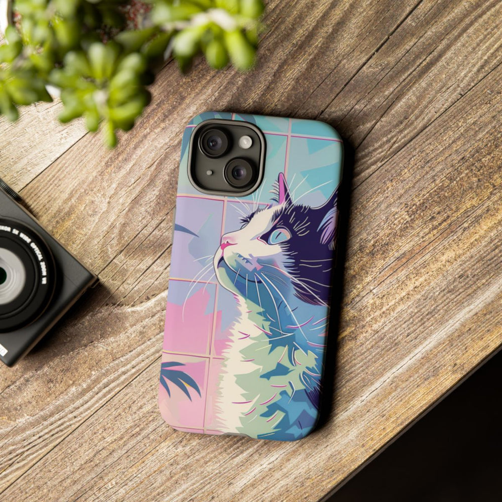Dit ontwerp toont een gestileerde kat met een zwart-wit vachtpatroon die omhoog kijkt. De achtergrond heeft een rasterpatroon in pasteltinten zoals blauw, roze en paars. Aan de linkerkant zijn tropische bladeren te zien in verschillende blauwe en groene tinten, wat een natuurlijk accent geeft aan het geheel. Het kunstwerk is uitgevoerd in een levendige, abstracte stijl met scherpe lijnen en kleurvlakken. Dit telefoonhoesje bestaat uit twee lagen van polycarbonaat en TPU en is mat afgewerkt, waardoor het extra stevig is en goed bestand tegen gebruik buitenshuis.