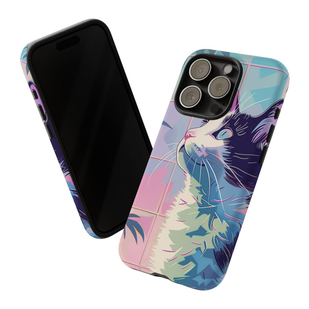 Dit ontwerp toont een gestileerde kat met een zwart-wit vachtpatroon die omhoog kijkt. De achtergrond heeft een rasterpatroon in pasteltinten zoals blauw, roze en paars. Aan de linkerkant zijn tropische bladeren te zien in verschillende blauwe en groene tinten, wat een natuurlijk accent geeft aan het geheel. Het kunstwerk is uitgevoerd in een levendige, abstracte stijl met scherpe lijnen en kleurvlakken. Dit telefoonhoesje bestaat uit twee lagen van polycarbonaat en TPU en is mat afgewerkt, waardoor het extra stevig is en goed bestand tegen gebruik buitenshuis.
