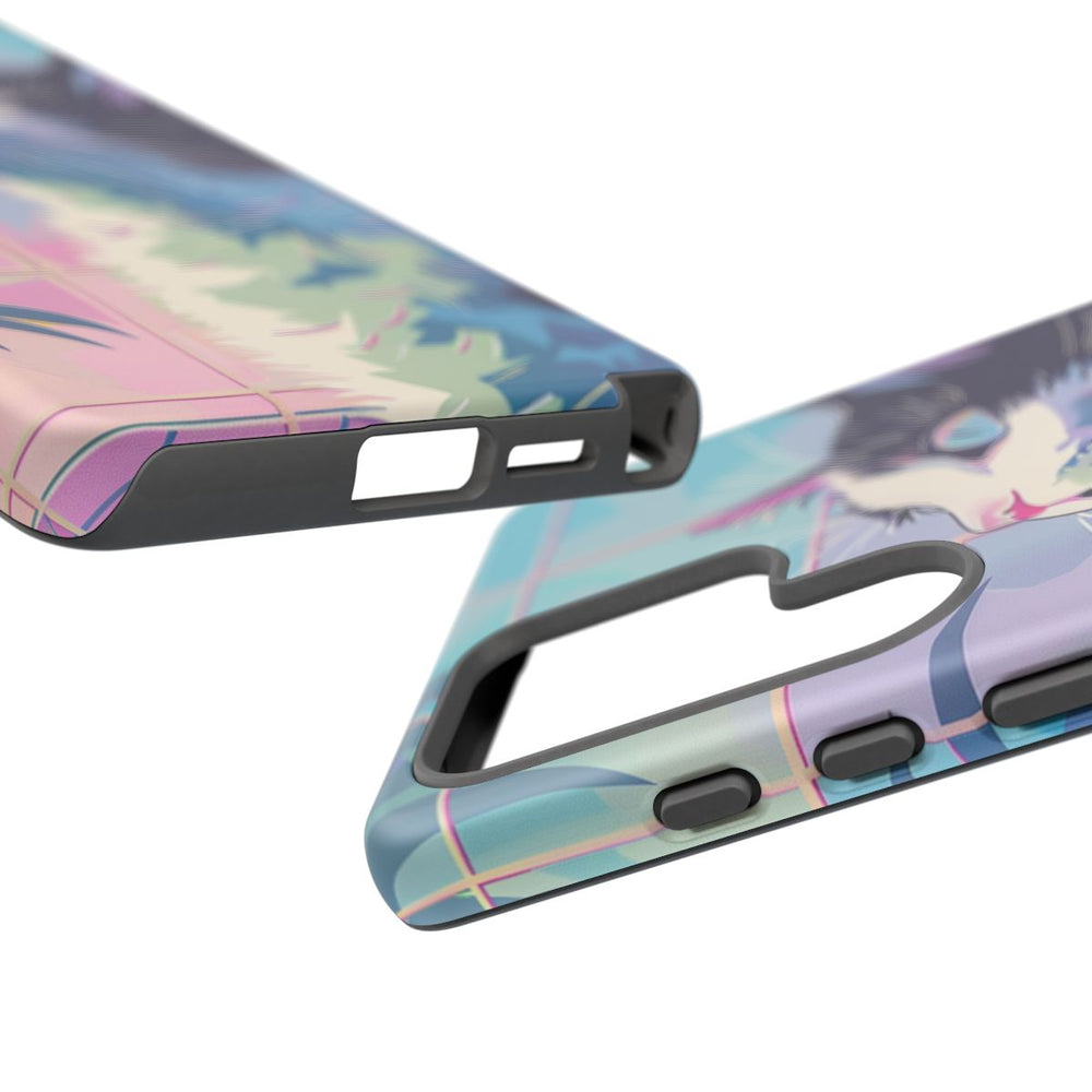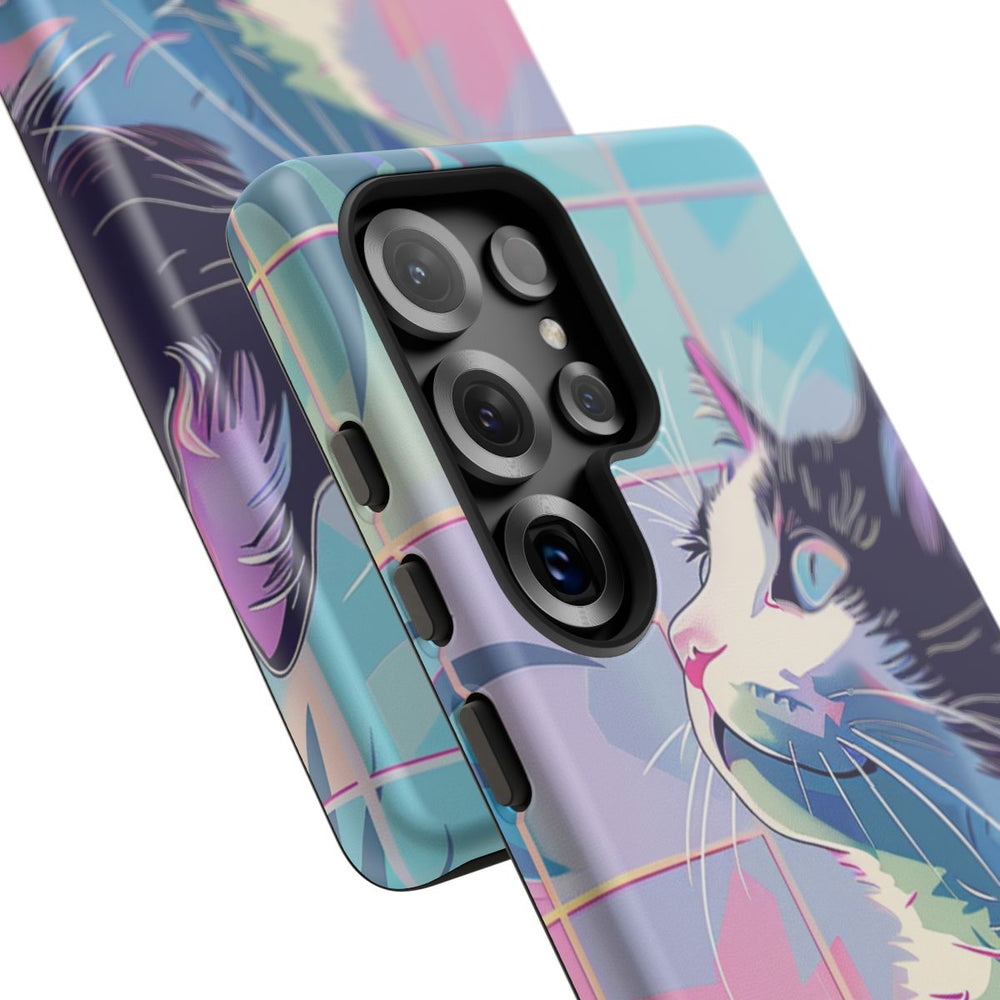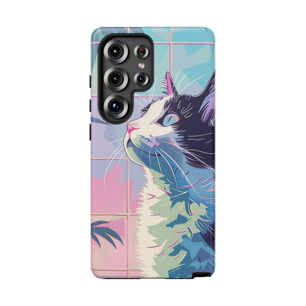 Dit ontwerp toont een gestileerde kat met een zwart-wit vachtpatroon die omhoog kijkt. De achtergrond heeft een rasterpatroon in pasteltinten zoals blauw, roze en paars. Aan de linkerkant zijn tropische bladeren te zien in verschillende blauwe en groene tinten, wat een natuurlijk accent geeft aan het geheel. Het kunstwerk is uitgevoerd in een levendige, abstracte stijl met scherpe lijnen en kleurvlakken. Dit telefoonhoesje bestaat uit twee lagen van polycarbonaat en TPU en is mat afgewerkt, waardoor het extra stevig is en goed bestand tegen gebruik buitenshuis.