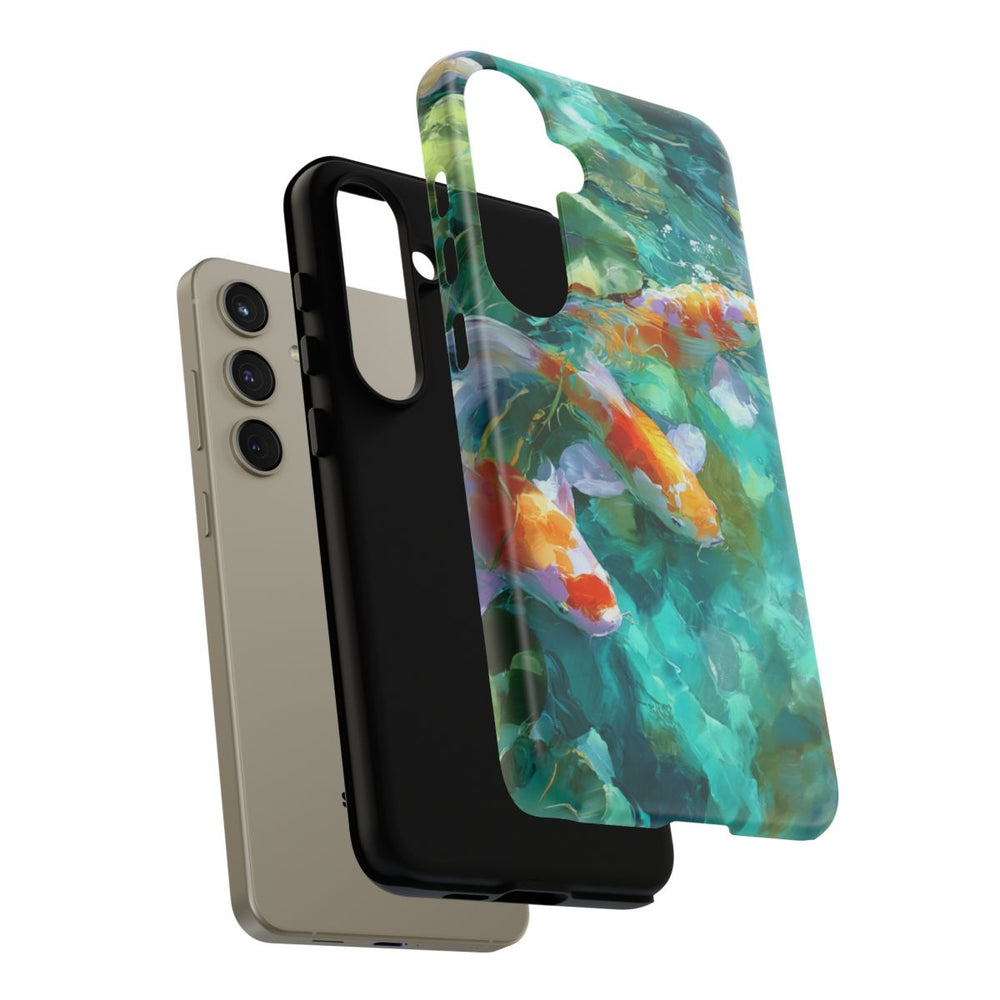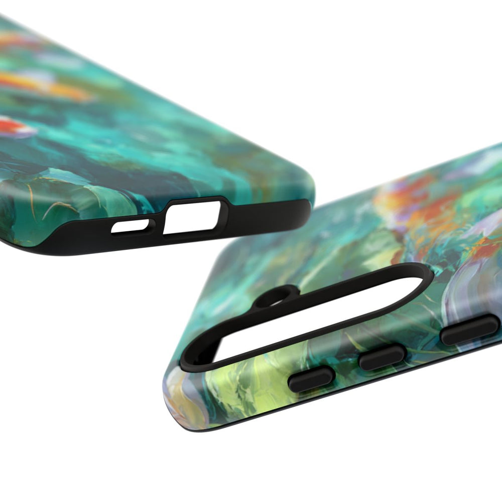 Dit hoesje toont levendige koi die sierlijk zwemmen tussen weelderige waterlelies in helder turquoise water. De felle kleuren zorgen voor een rustgevend en sfeervol onderwaterlandschap. Het ontwerp is uitgevoerd in aquarelstijl en benadrukt de gracieuze beweging van de vissen en de verfijnde bloemblaadjes van de waterlelies. Het matte hoesje biedt niet alleen bescherming, maar geeft je toestel ook een stijlvolle uitstraling.