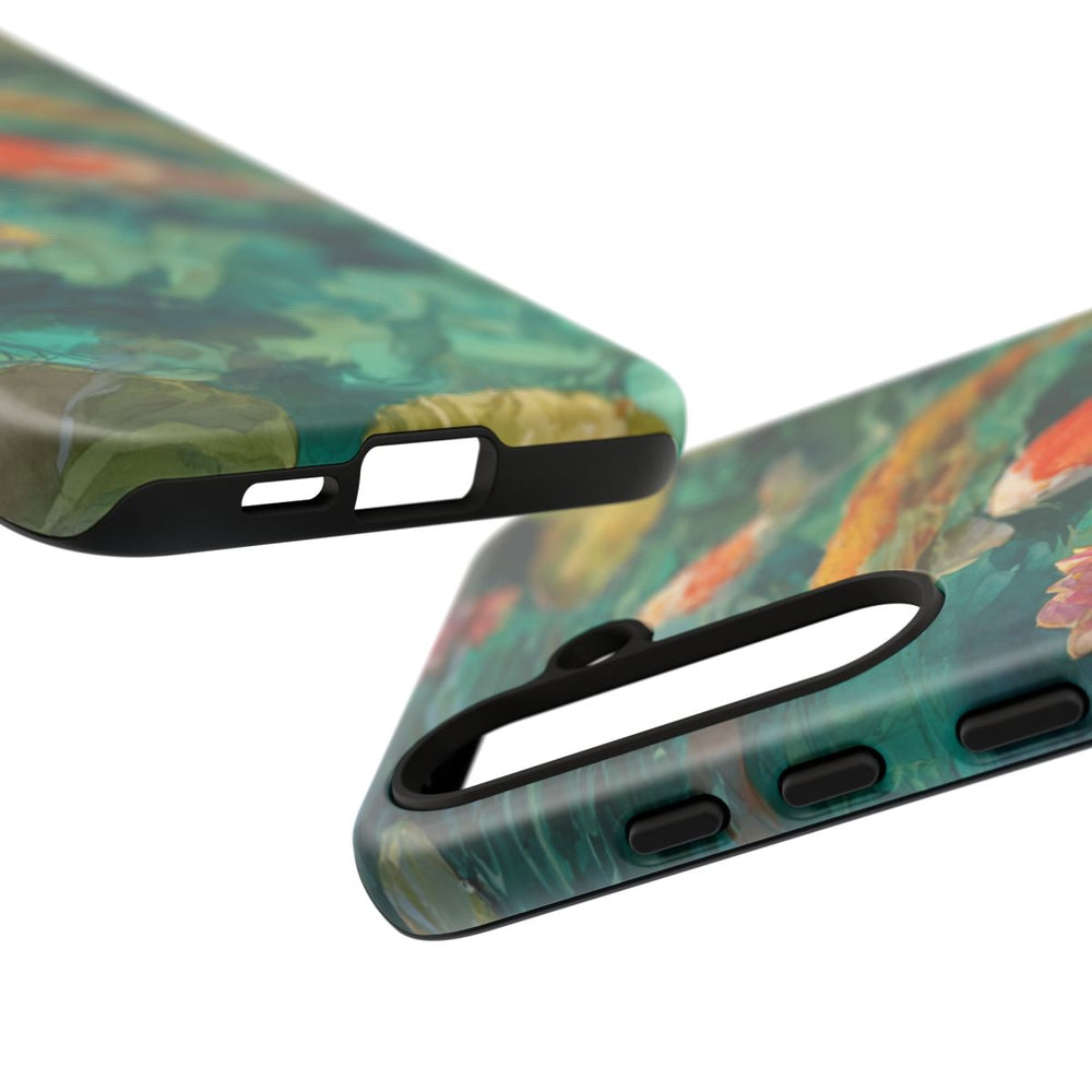 Dit hoesje is versierd met levendige koi karpers die sierlijk zwemmen tussen weelderige waterlelies in helder turquoise water. Het ontwerp brengt de schoonheid van de natuur tot leven met sprekende kleuren en een rustgevende, waterrijke sfeer. Dankzij de stevige dubbele laag biedt het hoesje uitstekende bescherming voor je toestel. Ondersteunt draadloos opladen en is daardoor ideaal voor dagelijks gebruik.