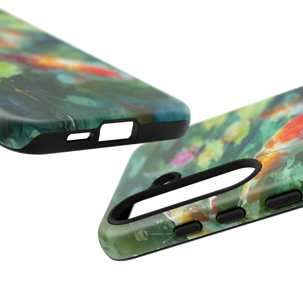 Dit hoesje toont sierlijke koi karpers die tussen weelderige groene waterlelies zwemmen in helder turquoise water. De aquarelstijl geeft een rustgevende en elegante uitstraling, waarbij de levendige kleuren de natuurlijke elementen extra laten opvallen. Het hoesje heeft een dubbele laag voor extra stevigheid en bescherming, en is geschikt voor draadloos opladen. Ideaal voor liefhebbers van de natuur en kunstzinnige ontwerpen.