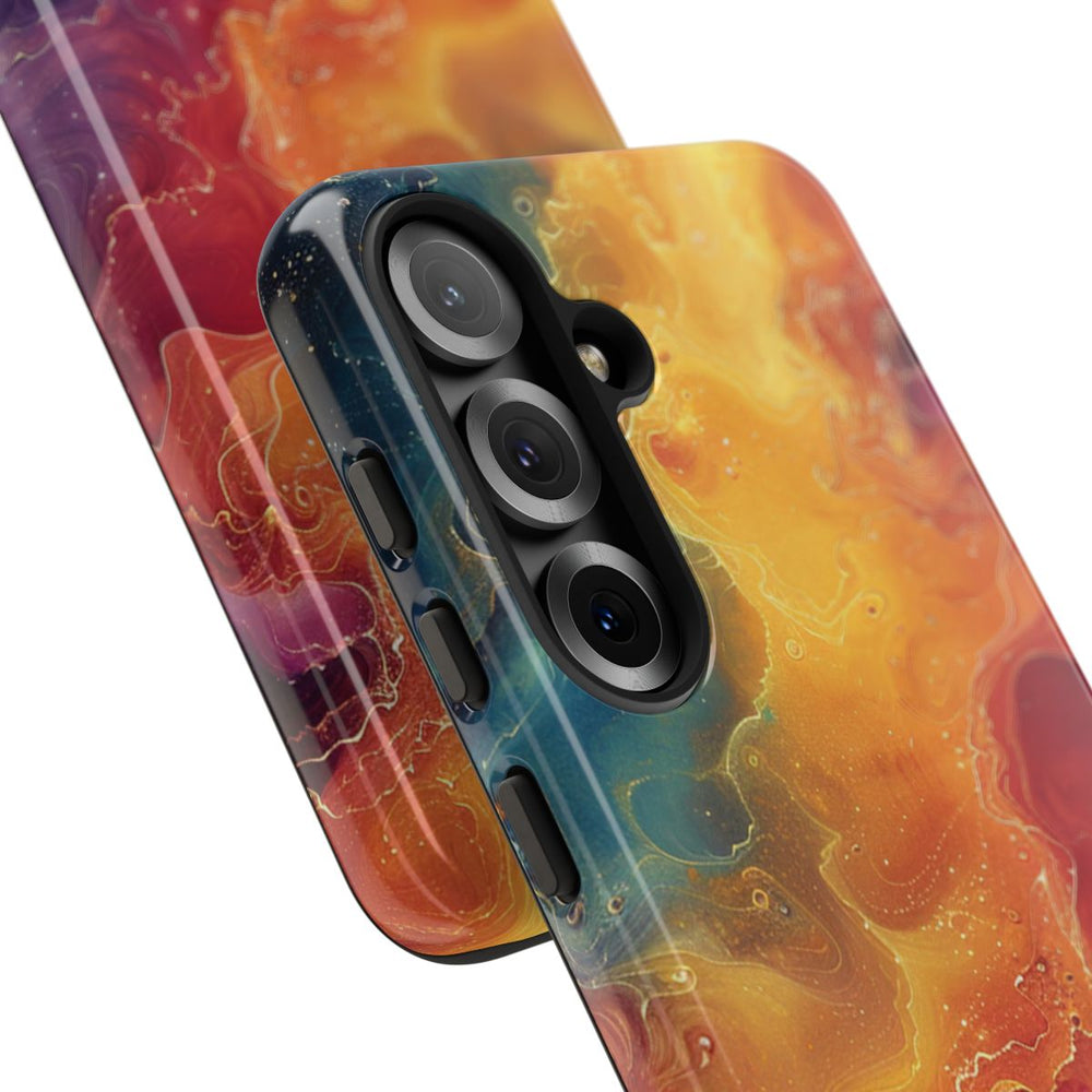 Dit hoesje heeft een levendig ontwerp van een kosmische nevel met golvende patronen in rijke tinten geel, oranje, rood, paars en blauw. De abstracte compositie laat vloeiende, golfachtige texturen zien die naadloos in elkaar overlopen en zorgen voor een dynamisch en energiek effect. Kleine, sterachtige stippen verspreid over de achtergrond versterken het ruimte-thema. Het hoesje is glanzend en stevig, gemaakt van duurzaam polycarbonaat met een TPU-voering, en biedt uitstekende bescherming. Geschikt voor draadloos opladen.