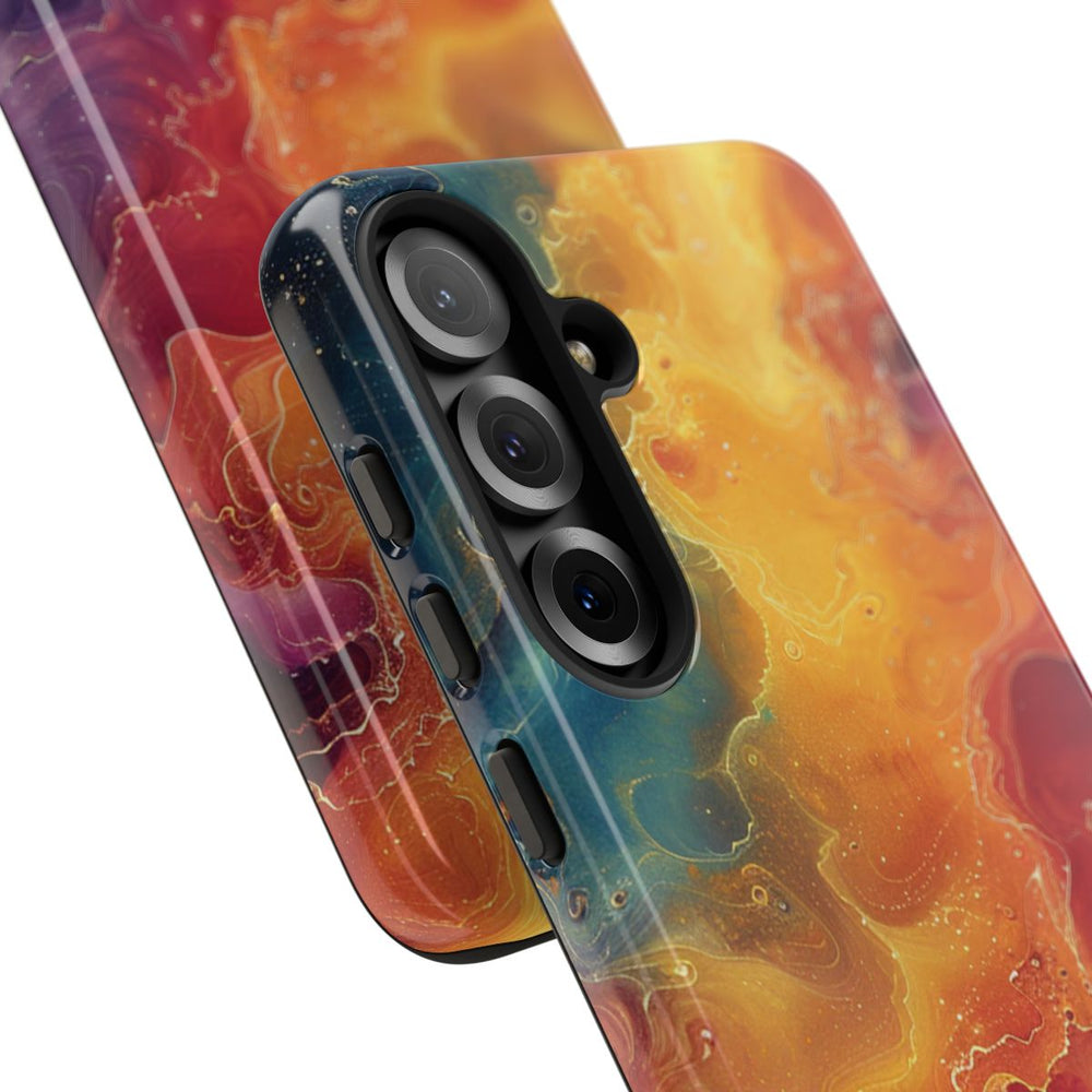 Dit hoesje heeft een levendig ontwerp van een kosmische nevel met golvende patronen in rijke tinten geel, oranje, rood, paars en blauw. De abstracte compositie laat vloeiende, golfachtige texturen zien die naadloos in elkaar overlopen en zorgen voor een dynamisch en energiek effect. Kleine, sterachtige stippen verspreid over de achtergrond versterken het ruimte-thema. Het hoesje is glanzend en stevig, gemaakt van duurzaam polycarbonaat met een TPU-voering, en biedt uitstekende bescherming. Geschikt voor draadloos opladen.