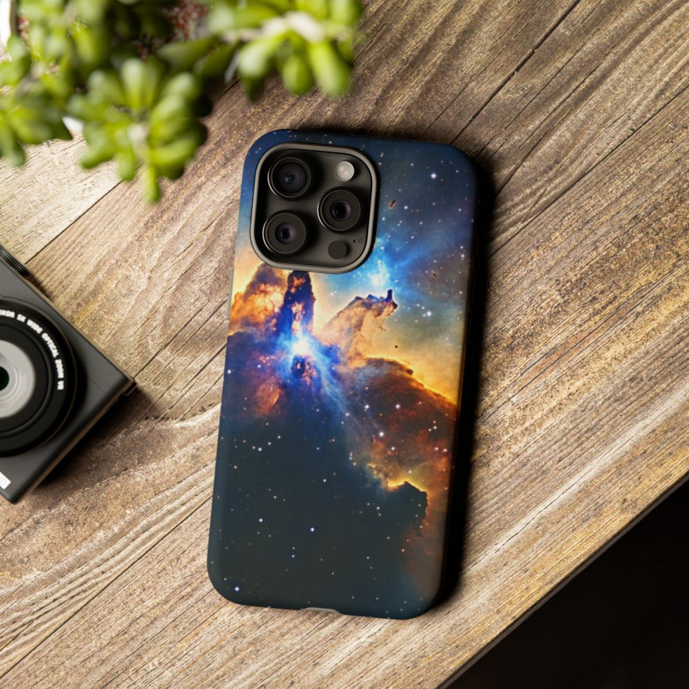 Dit ontwerp toont een levendige kosmische nevel met felblauwe, oranje en gele lichtgevende wolken van gas en stof tegen een donkere ruimteachtergrond vol kleine witte sterren. De afbeelding brengt de dynamiek en kleurrijkheid van het heelal prachtig in beeld. Dit matte, stevige telefoonhoesje is voorzien van een polycarbonaat buitenkant en een TPU-binnenlaag, waardoor het optimale bescherming biedt. Het hoesje ondersteunt draadloos opladen.