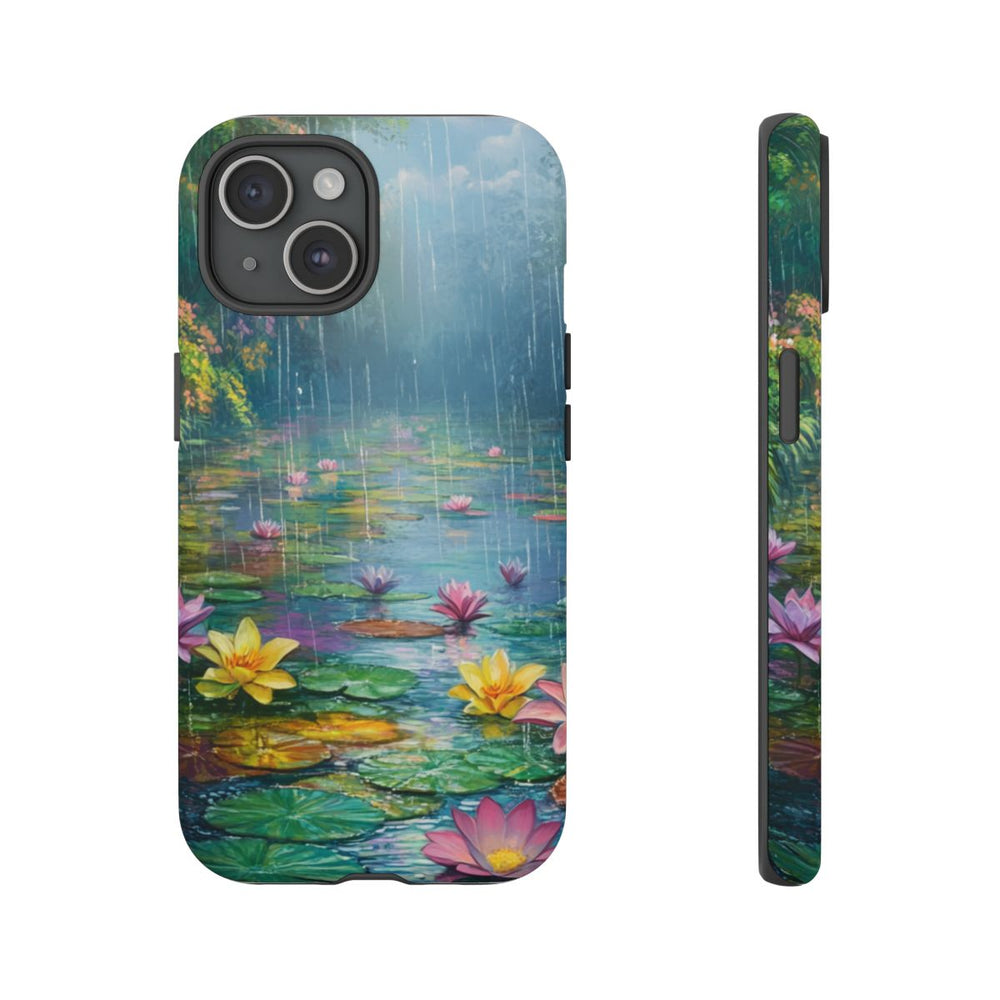 Dit ontwerp toont een rustgevend waterlandschap met lotus bloemen in verschillende kleuren, omringd door weelderig groene bladeren. Op de achtergrond zorgt een mistige sfeer met zachte regendruppels voor een dromerige en kalme uitstraling. De kleurrijke bloemen komen prachtig naar voren tegen het spiegelende wateroppervlak en benadrukken de schoonheid van de natuur. Dit matte en stevige hoesje is gemaakt van duurzame materialen en sluit perfect aan op het toestel, terwijl draadloos opladen mogelijk blijft.