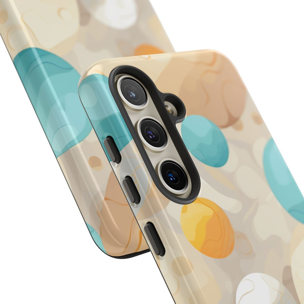 Dit ontwerp toont een patroon van gladde, ronde bollen in verschillende groottes en kleuren, zoals blauw, wit en oranje. De bollen hebben subtiele marmerachtige structuren met fijne lijnen en schaduwen, wat zorgt voor diepte en dimensie. De achtergrond bestaat uit zachte beige en crèmekleurige tinten met abstracte vormen die de zwevende bollen mooi aanvullen. Het patroon is gedrukt op een glanzend en stevig telefoonhoesje van polycarbonaat en TPU, dat bestaat uit twee beschermende lagen en geschikt is voor draadloos opladen.