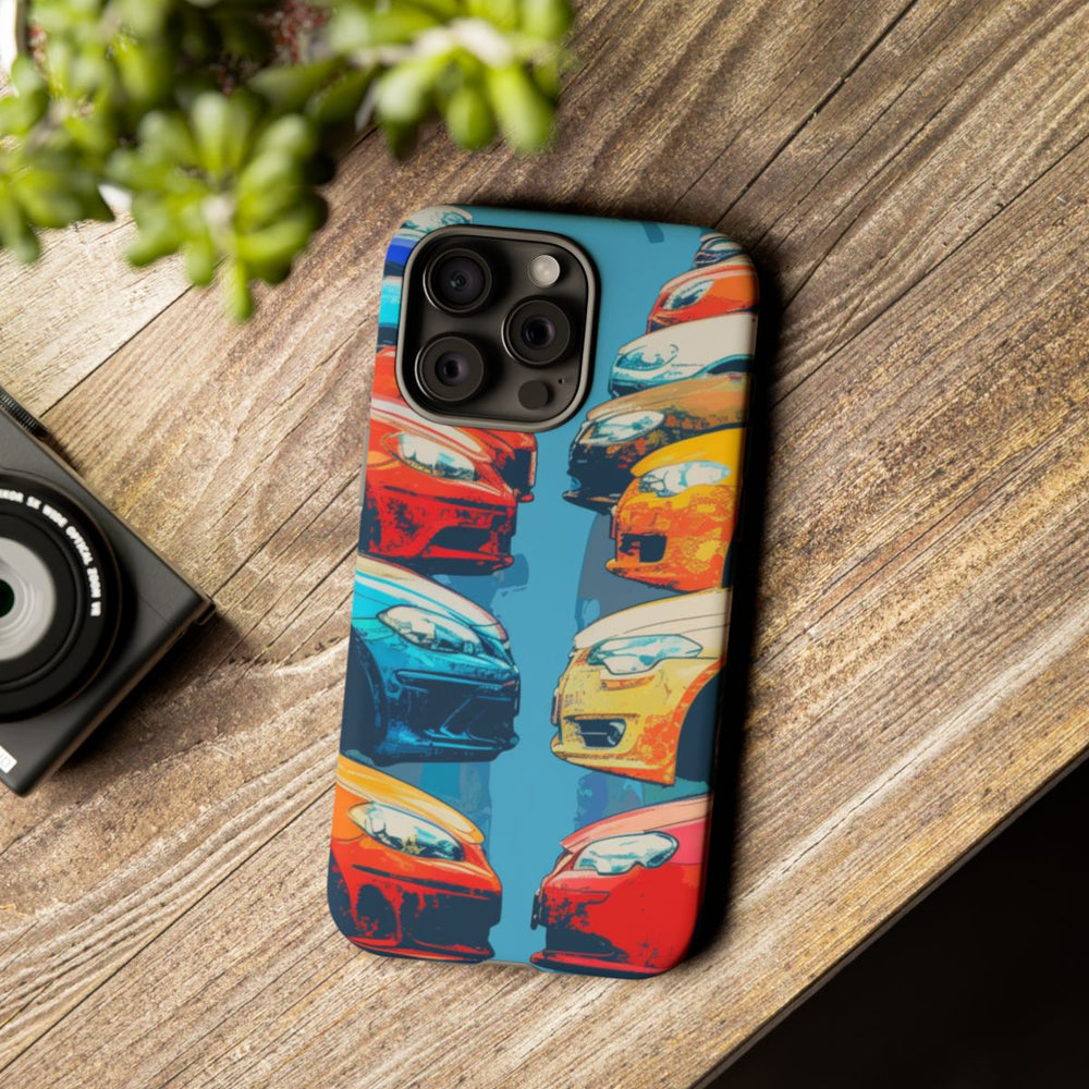 Dit ontwerp toont een rij moderne auto's in een kleurrijke lijntekening, waarbij de auto's tegenover elkaar staan in twee rijen. De auto's zijn afgebeeld in levendige tinten rood, oranje, geel, blauw en wit op een blauwe achtergrond. De afbeelding heeft een grafische, bijna geschilderde uitstraling met zichtbare texturen en contouren die de vormen en details van de voertuigen benadrukken. Deze afbeelding is gedrukt op een stevig, mat telefoonhoesje van polycarbonaat en TPU, dat optimale bescherming biedt en geschikt is voor draadloos opladen.