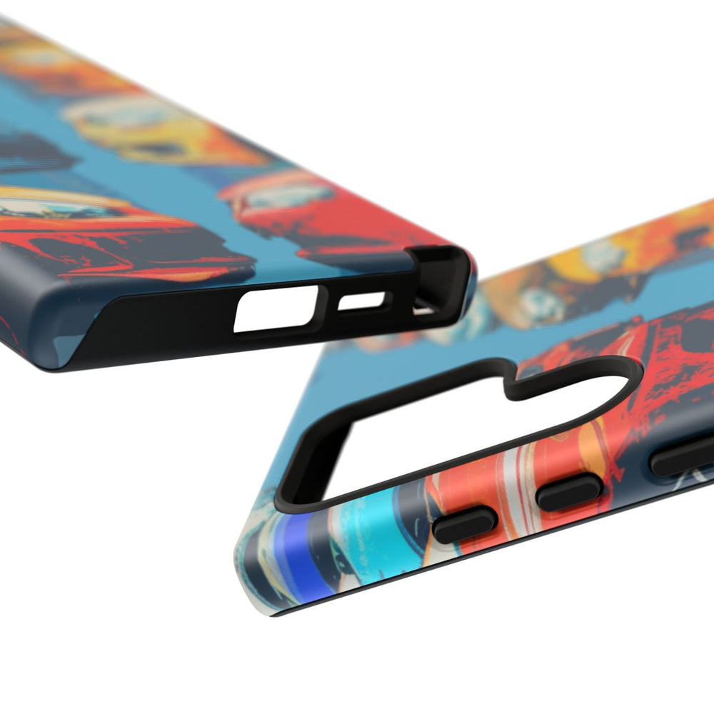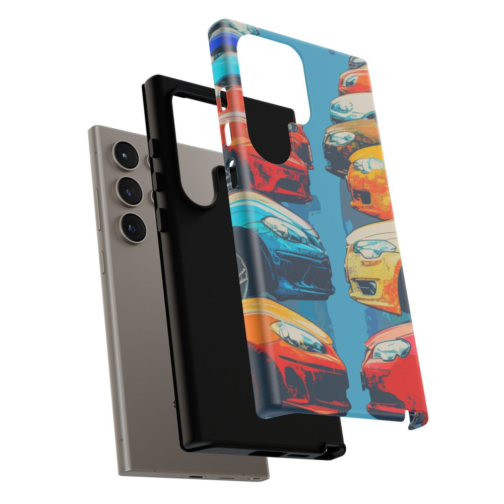 Dit ontwerp toont een rij moderne auto's in een kleurrijke lijntekening, waarbij de auto's tegenover elkaar staan in twee rijen. De auto's zijn afgebeeld in levendige tinten rood, oranje, geel, blauw en wit op een blauwe achtergrond. De afbeelding heeft een grafische, bijna geschilderde uitstraling met zichtbare texturen en contouren die de vormen en details van de voertuigen benadrukken. Deze afbeelding is gedrukt op een stevig, mat telefoonhoesje van polycarbonaat en TPU, dat optimale bescherming biedt en geschikt is voor draadloos opladen.