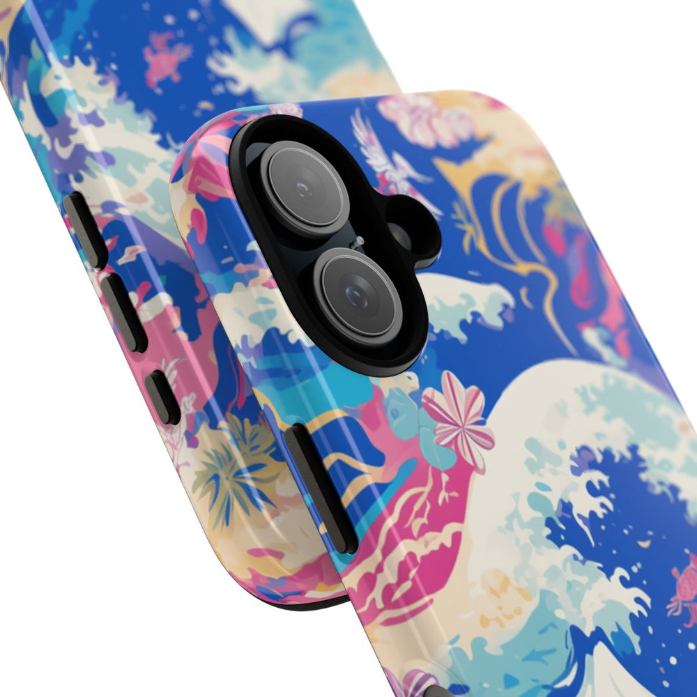 Dit hoesje heeft een levendig ontwerp met oceaangolven in tinten blauw en wit, aangevuld met accenten van roze, paars en beige. Door het patroon heen zijn verschillende bloemen en kleine vogels verwerkt, wat zorgt voor een speelse en dynamische uitstraling. De combinatie van natuurlijke golfvormen en abstracte bloemmotieven maakt het geheel visueel aantrekkelijk en kleurrijk. Het hoesje is glanzend en stevig dankzij de dubbele laag, biedt optimale bescherming en is geschikt voor draadloos opladen.