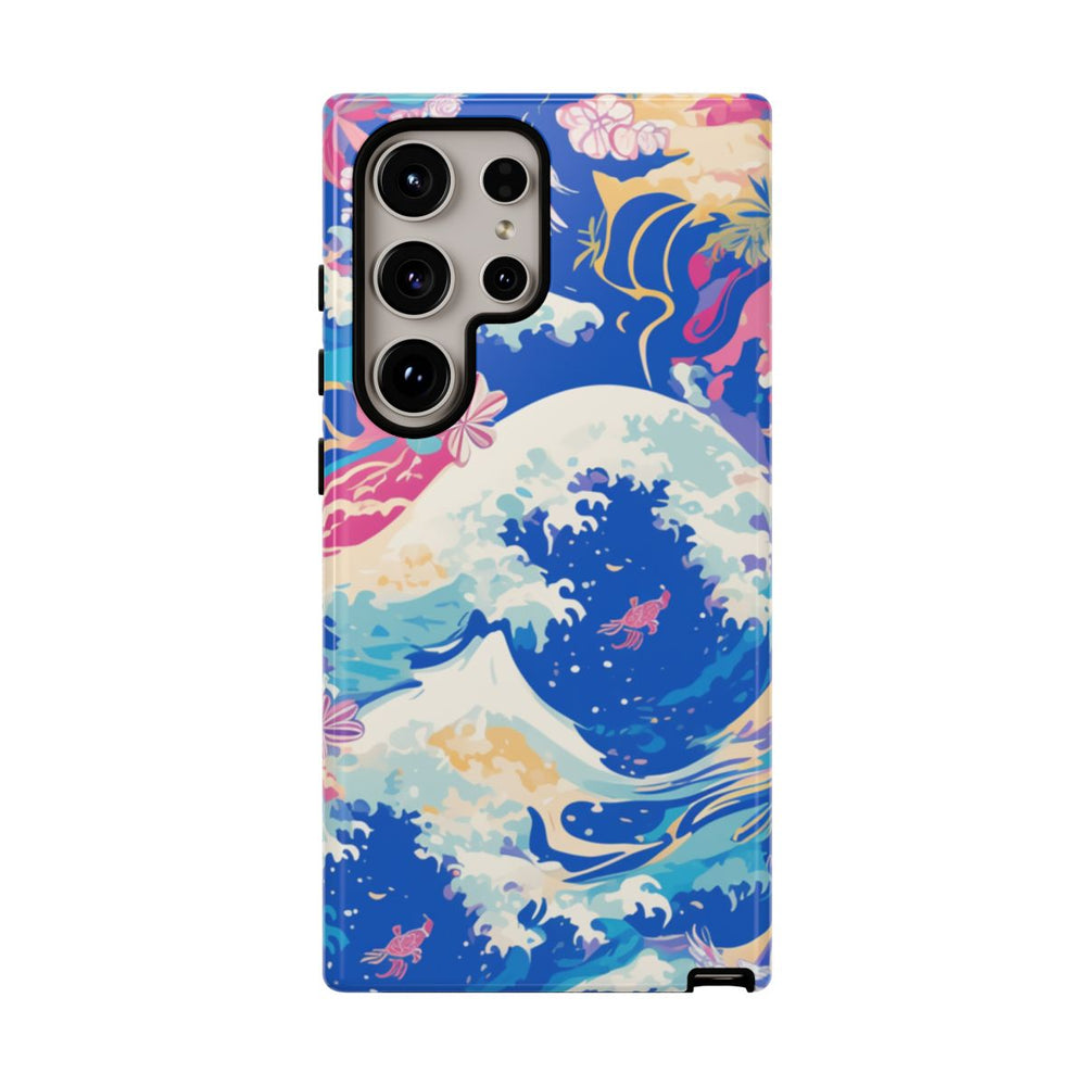 Dit hoesje heeft een levendig ontwerp met oceaangolven in tinten blauw en wit, aangevuld met accenten van roze, paars en beige. Door het patroon heen zijn verschillende bloemen en kleine vogels verwerkt, wat zorgt voor een speelse en dynamische uitstraling. De combinatie van natuurlijke golfvormen en abstracte bloemmotieven maakt het geheel visueel aantrekkelijk en kleurrijk. Het hoesje is glanzend en stevig dankzij de dubbele laag, biedt optimale bescherming en is geschikt voor draadloos opladen.