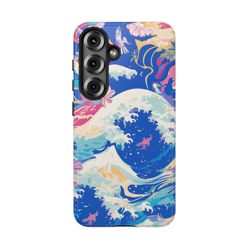 Dit hoesje heeft een levendig ontwerp met oceaangolven in tinten blauw en wit, aangevuld met accenten van roze, paars en beige. Door het patroon heen zijn verschillende bloemen en kleine vogels verwerkt, wat zorgt voor een speelse en dynamische uitstraling. De combinatie van natuurlijke golfvormen en abstracte bloemmotieven maakt het geheel visueel aantrekkelijk en kleurrijk. Het hoesje is glanzend en stevig dankzij de dubbele laag, biedt optimale bescherming en is geschikt voor draadloos opladen.