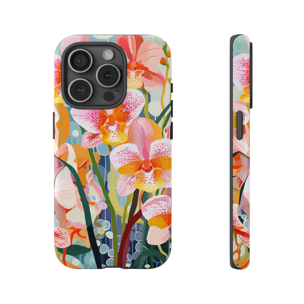 Dit hoesje is voorzien van een levendige illustratie van orchideeën met grote bloemblaadjes in tinten roze, oranje, geel en rood. De bloemen zijn gedetailleerd met gespikkelde patronen en worden omringd door groene bladeren en stelen. Op de achtergrond zorgen abstracte cirkelvormen in gedempte blauw- en grijstinten voor extra diepte en contrast. Het hoesje bestaat uit twee lagen, is glanzend afgewerkt en gemaakt van polycarbonaat en TPU. Dit zorgt voor een stevige bescherming en maakt draadloos opladen mogelijk.