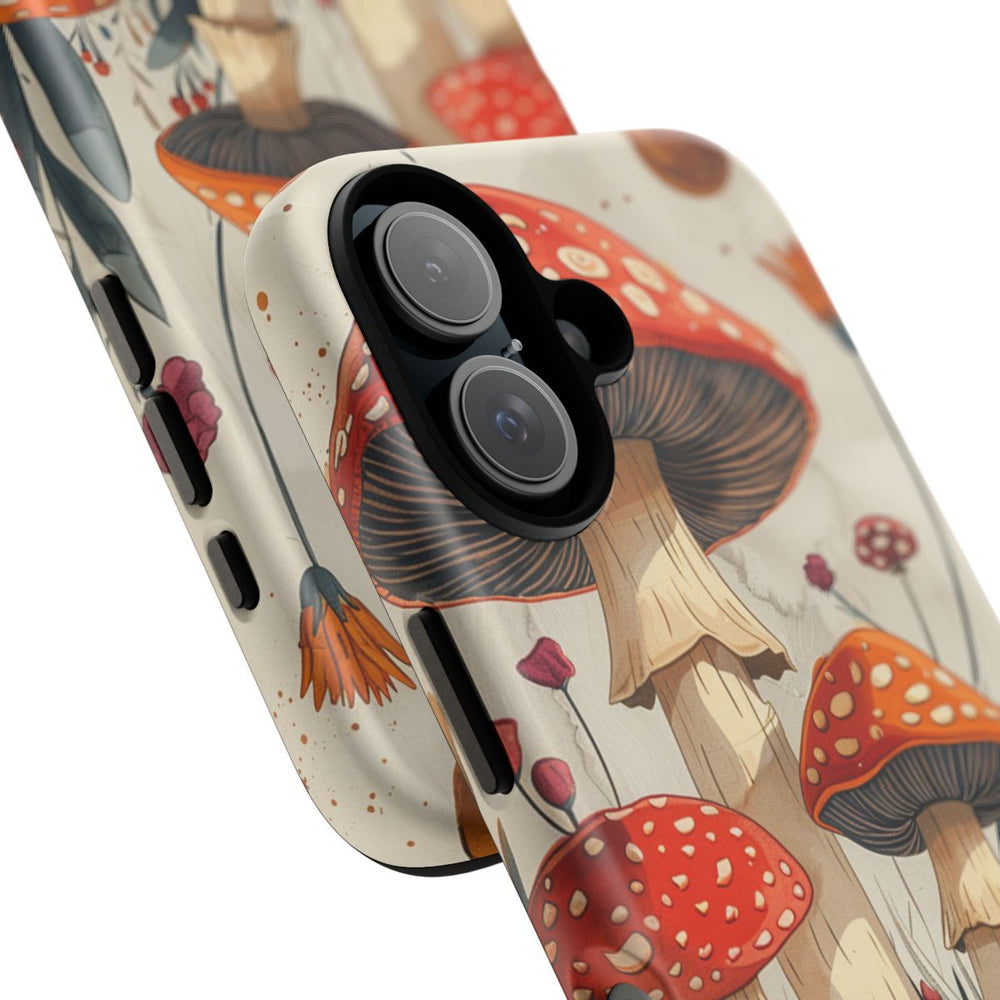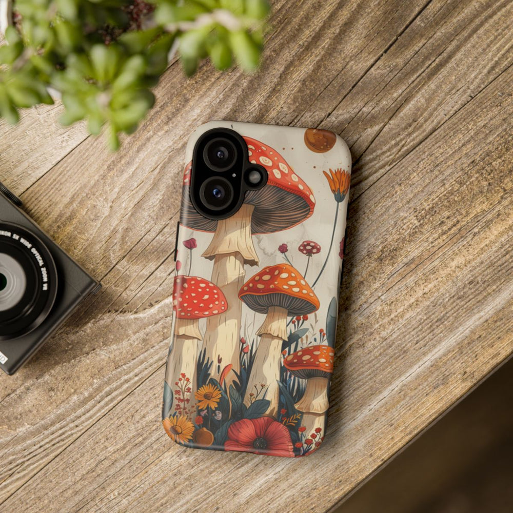 Geef je telefoon een vrolijke uitstraling met dit matte, stevige hoesje met een opvallend patroon van kleurrijke paddenstoelen, pastelkleurige bloemen en zonnige details. Het ontwerp is geïnspireerd op klassieke illustraties en combineert heldere paarstinten met zachte roze en violette accenten. Dankzij de stevige dubbele laag biedt dit hoesje uitstekende bescherming en is het geschikt voor draadloos opladen. Ideaal voor liefhebbers van unieke kunst die hun toestel veilig en stijlvol willen houden.