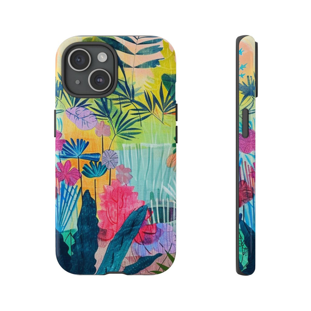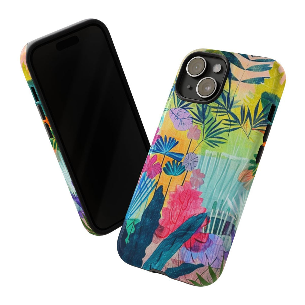 Dit hoesje is voorzien van een levendige en kleurrijke illustratie van een tropische tuin, vol met verschillende bladeren en bloemen. Het ontwerp combineert grote en kleine bladeren in tinten blauw, groen, paars, oranje, geel en roze. De achtergrond bestaat uit zachte pasteltinten met gelaagde texturen, wat zorgt voor diepte en een speels effect. De afbeelding is sprankelend en artistiek, gedrukt op een glanzend en stevig hoesje van duurzaam polycarbonaat met een TPU-voering. Dit hoesje biedt uitstekende bescherming en is geschikt voor draadloos opladen.