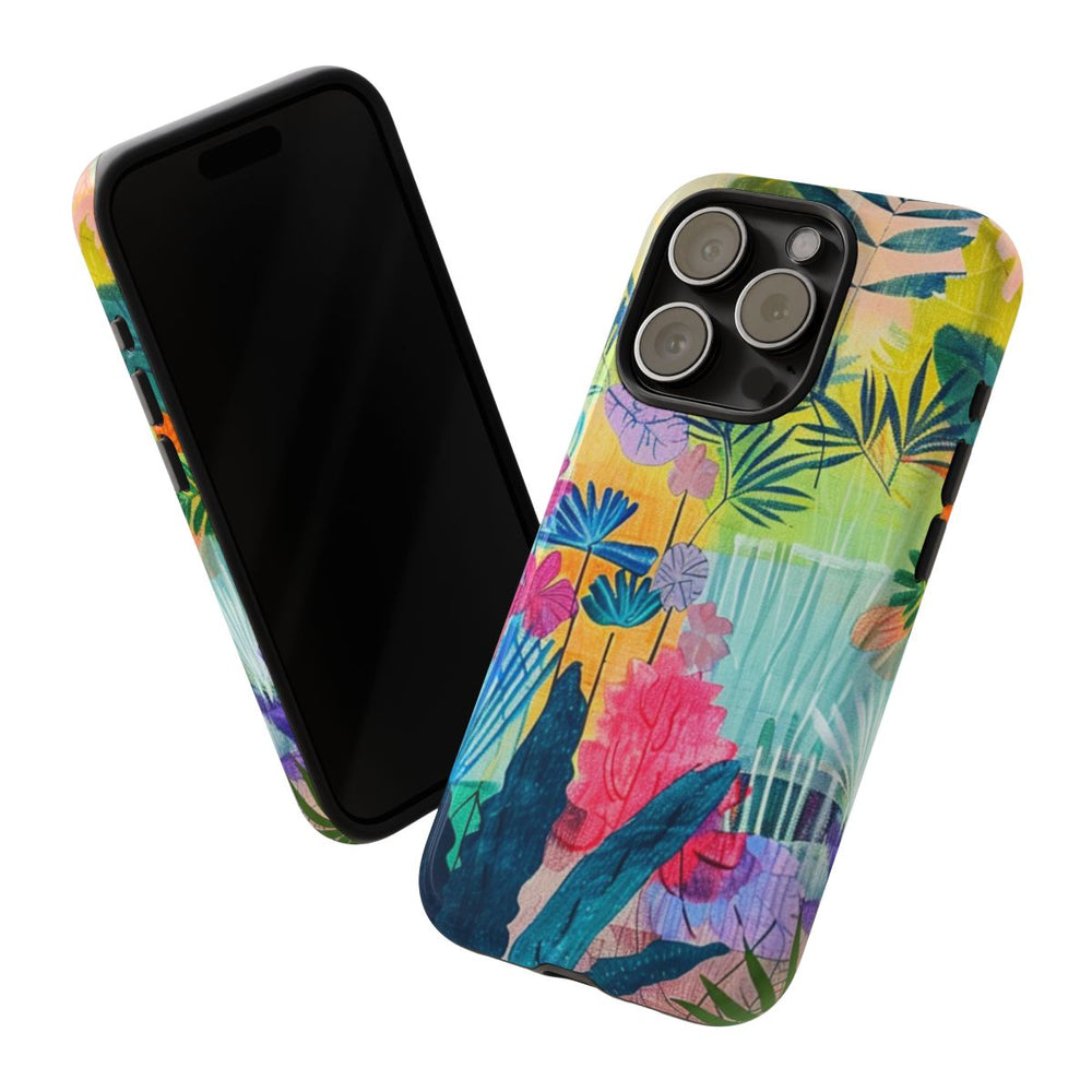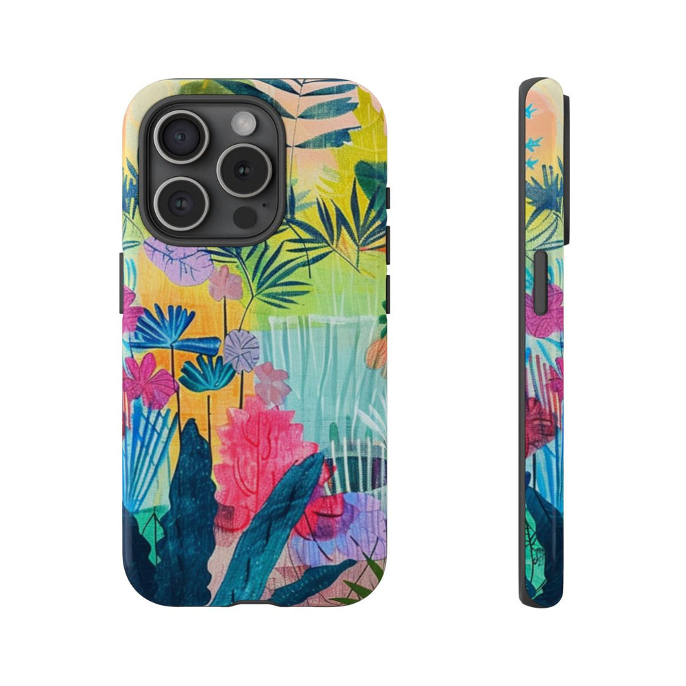 Dit hoesje is voorzien van een levendige en kleurrijke illustratie van een tropische tuin, vol met verschillende bladeren en bloemen. Het ontwerp combineert grote en kleine bladeren in tinten blauw, groen, paars, oranje, geel en roze. De achtergrond bestaat uit zachte pasteltinten met gelaagde texturen, wat zorgt voor diepte en een speels effect. De afbeelding is sprankelend en artistiek, gedrukt op een glanzend en stevig hoesje van duurzaam polycarbonaat met een TPU-voering. Dit hoesje biedt uitstekende bescherming en is geschikt voor draadloos opladen.