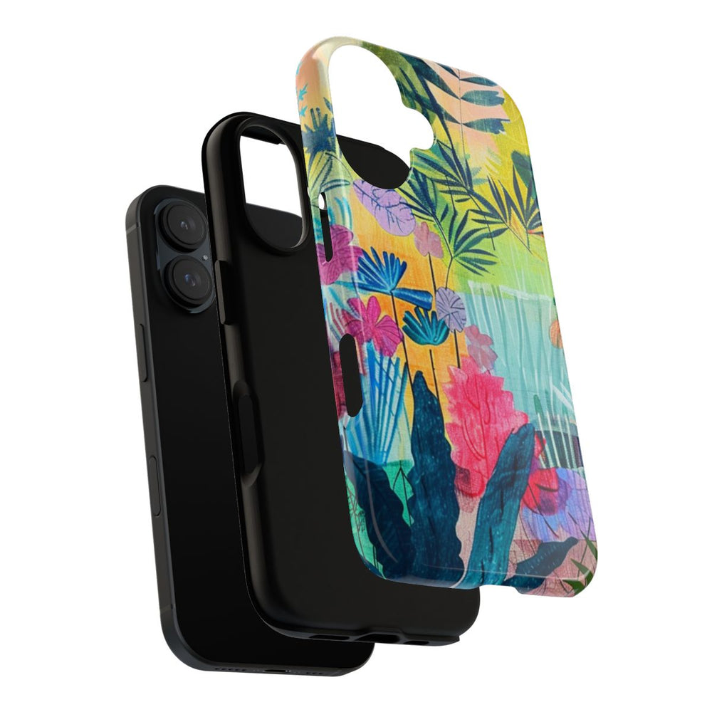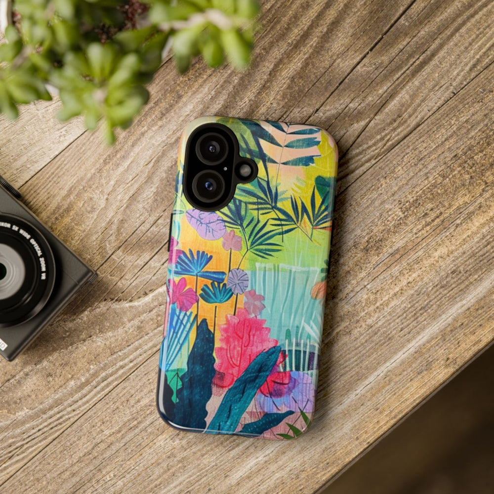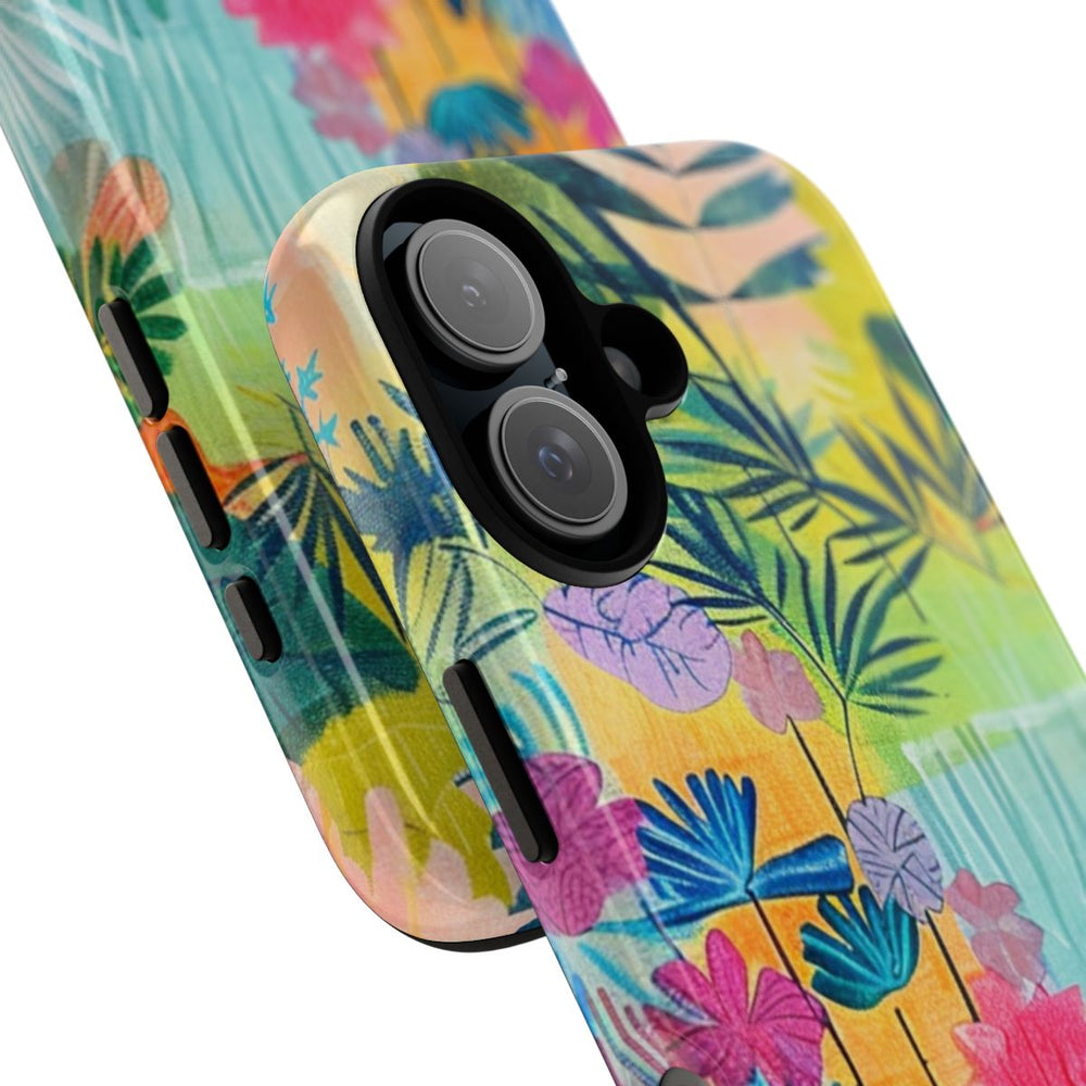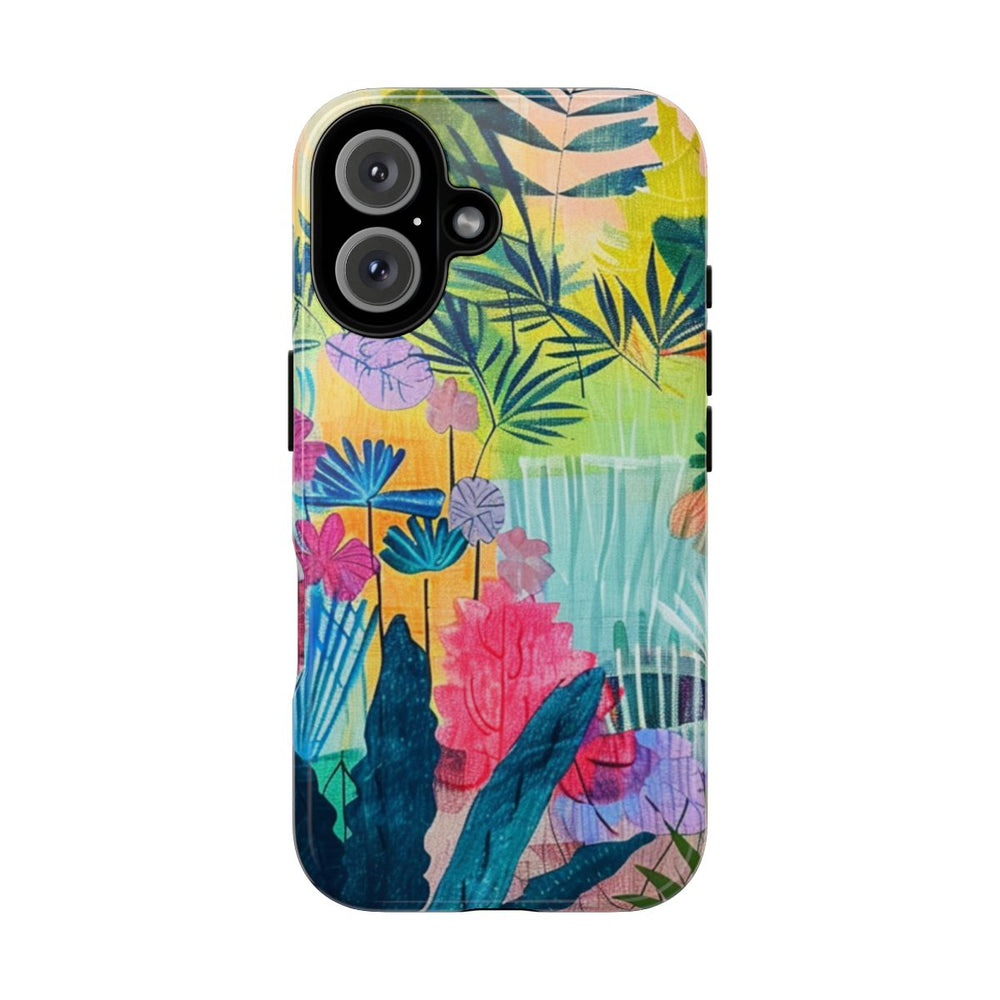 Dit hoesje is voorzien van een levendige en kleurrijke illustratie van een tropische tuin, vol met verschillende bladeren en bloemen. Het ontwerp combineert grote en kleine bladeren in tinten blauw, groen, paars, oranje, geel en roze. De achtergrond bestaat uit zachte pasteltinten met gelaagde texturen, wat zorgt voor diepte en een speels effect. De afbeelding is sprankelend en artistiek, gedrukt op een glanzend en stevig hoesje van duurzaam polycarbonaat met een TPU-voering. Dit hoesje biedt uitstekende bescherming en is geschikt voor draadloos opladen.