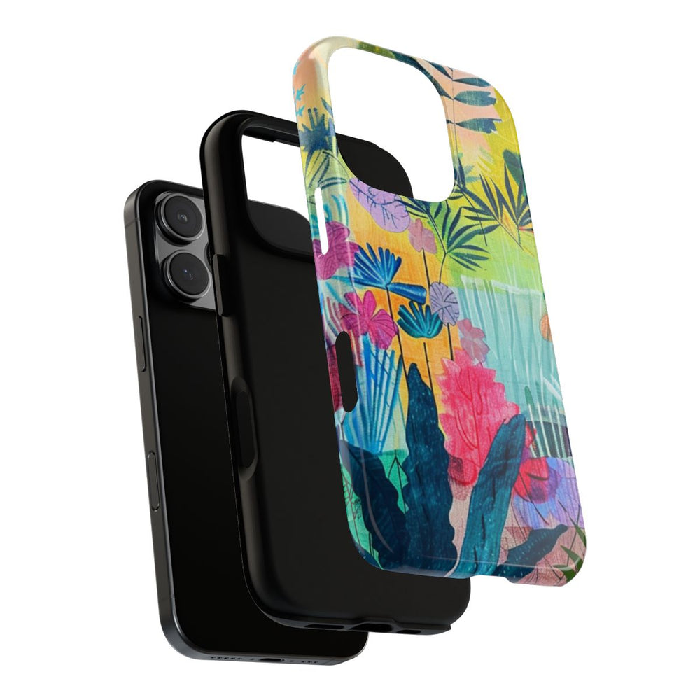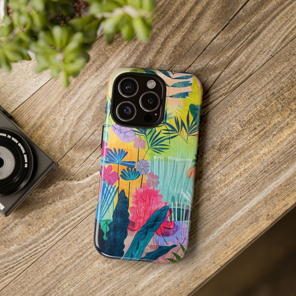 Dit hoesje is voorzien van een levendige en kleurrijke illustratie van een tropische tuin, vol met verschillende bladeren en bloemen. Het ontwerp combineert grote en kleine bladeren in tinten blauw, groen, paars, oranje, geel en roze. De achtergrond bestaat uit zachte pasteltinten met gelaagde texturen, wat zorgt voor diepte en een speels effect. De afbeelding is sprankelend en artistiek, gedrukt op een glanzend en stevig hoesje van duurzaam polycarbonaat met een TPU-voering. Dit hoesje biedt uitstekende bescherming en is geschikt voor draadloos opladen.