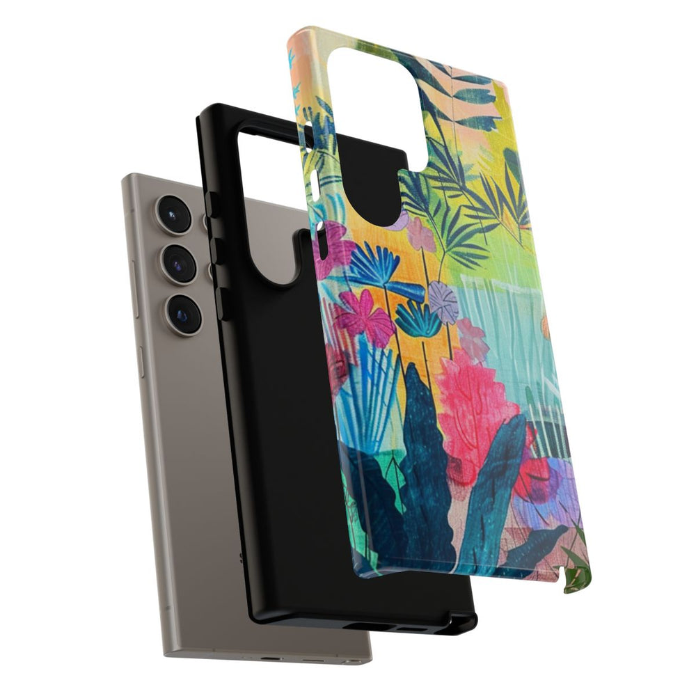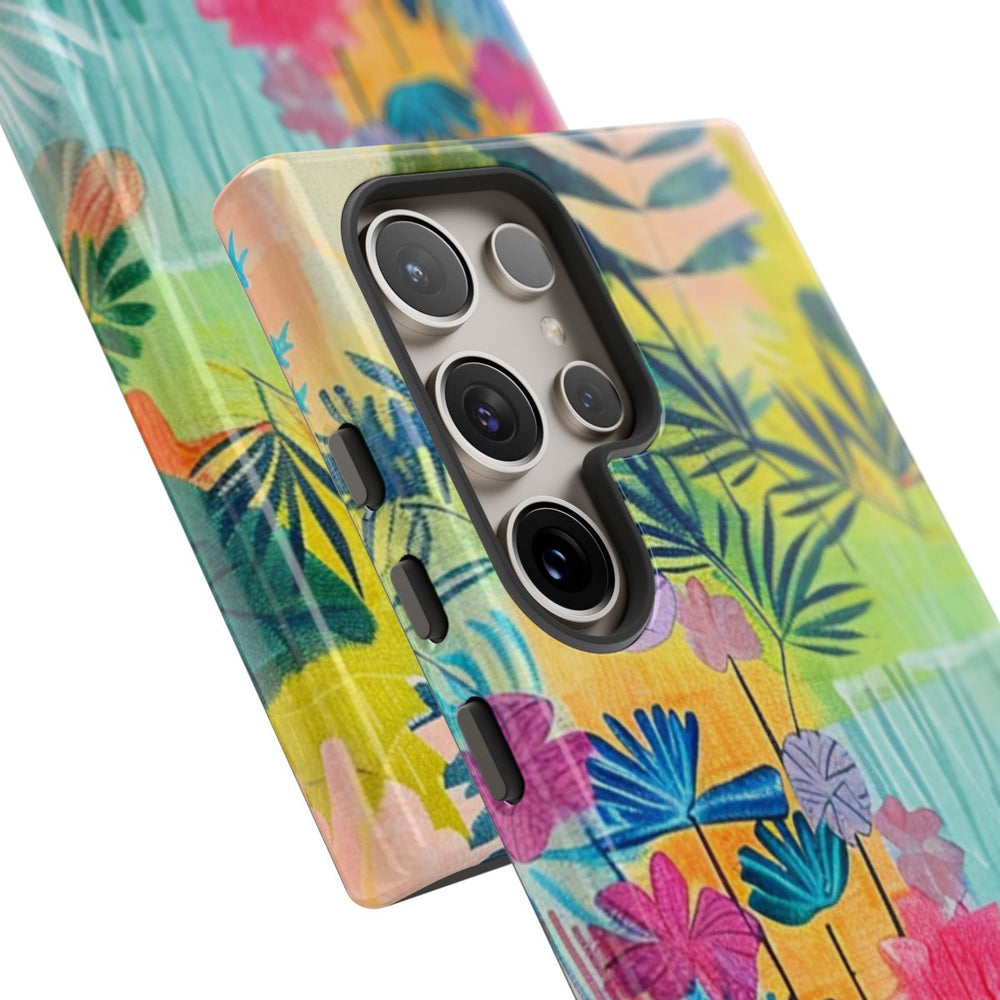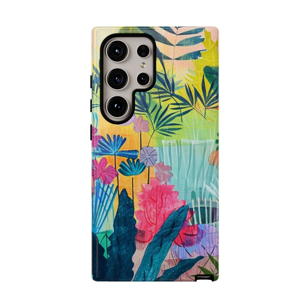 Dit hoesje is voorzien van een levendige en kleurrijke illustratie van een tropische tuin, vol met verschillende bladeren en bloemen. Het ontwerp combineert grote en kleine bladeren in tinten blauw, groen, paars, oranje, geel en roze. De achtergrond bestaat uit zachte pasteltinten met gelaagde texturen, wat zorgt voor diepte en een speels effect. De afbeelding is sprankelend en artistiek, gedrukt op een glanzend en stevig hoesje van duurzaam polycarbonaat met een TPU-voering. Dit hoesje biedt uitstekende bescherming en is geschikt voor draadloos opladen.
