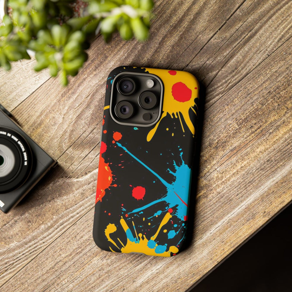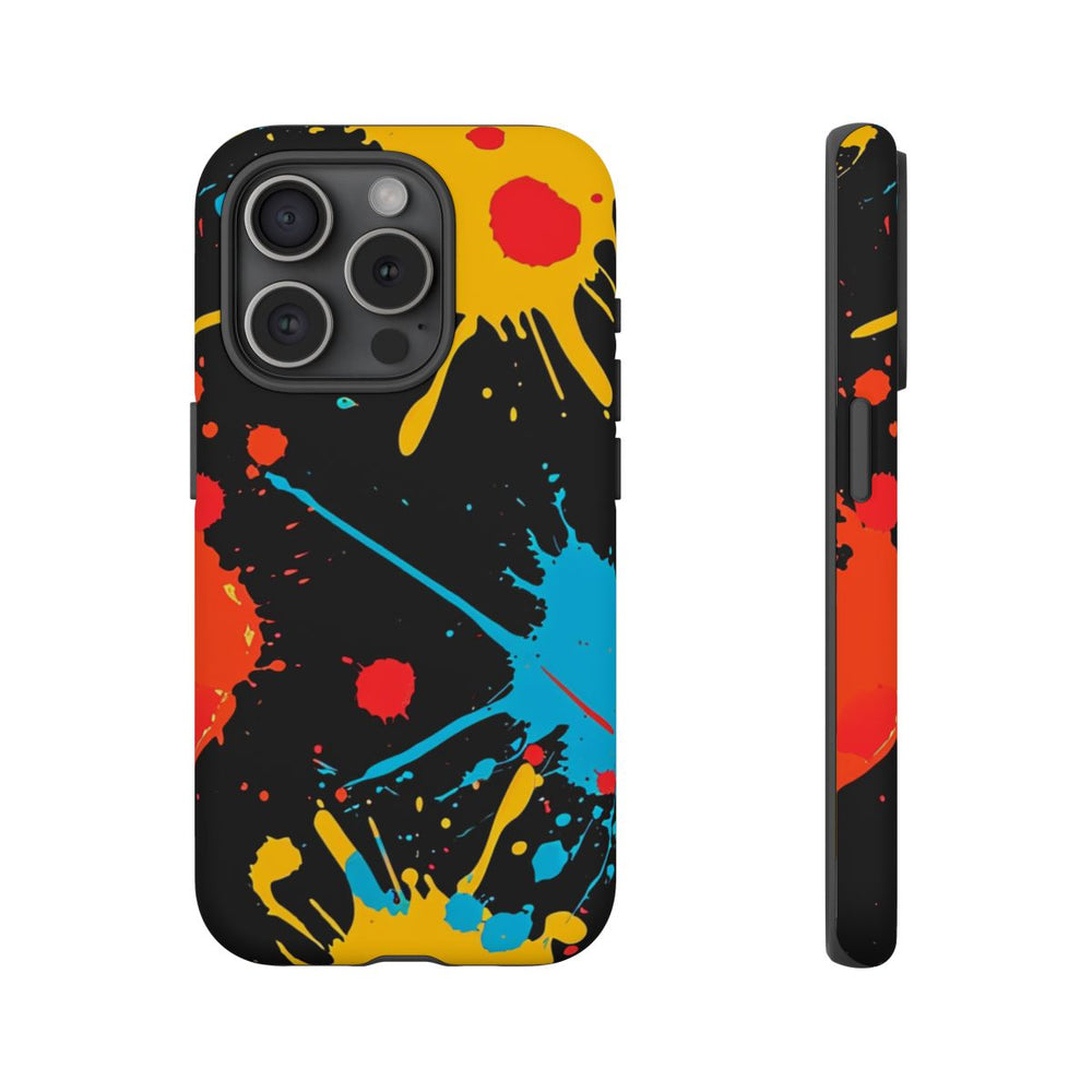 Dit hoesje heeft een opvallend ontwerp met levendige verfspatten in geel, rood en blauw op een diepe zwarte achtergrond. De spatten verschillen in grootte en vorm, waardoor een dynamisch en energiek patroon ontstaat. Het stevige hoesje bestaat uit twee lagen, met een buitenkant van polycarbonaat en een TPU-voering voor extra bescherming en duurzaamheid. Het hoesje ondersteunt draadloos opladen en is bestand tegen weersinvloeden, zodat de kleuren langdurig mooi blijven.