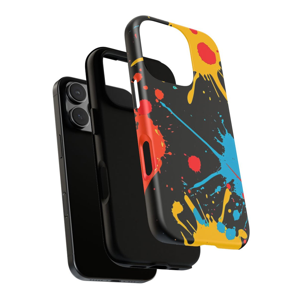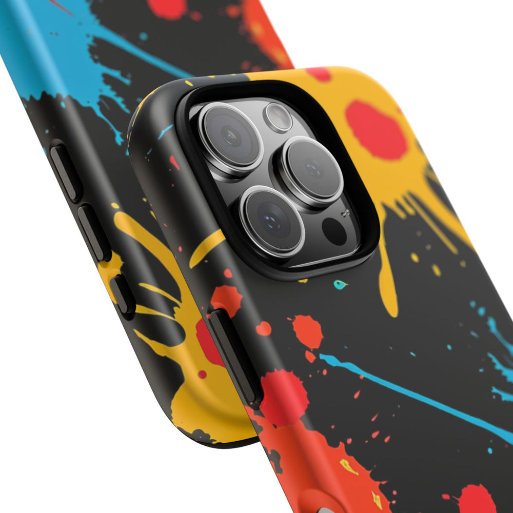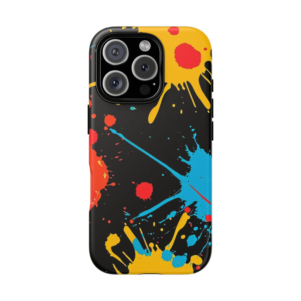 Dit hoesje heeft een opvallend ontwerp met levendige verfspatten in geel, rood en blauw op een diepe zwarte achtergrond. De spatten verschillen in grootte en vorm, waardoor een dynamisch en energiek patroon ontstaat. Het stevige hoesje bestaat uit twee lagen, met een buitenkant van polycarbonaat en een TPU-voering voor extra bescherming en duurzaamheid. Het hoesje ondersteunt draadloos opladen en is bestand tegen weersinvloeden, zodat de kleuren langdurig mooi blijven.