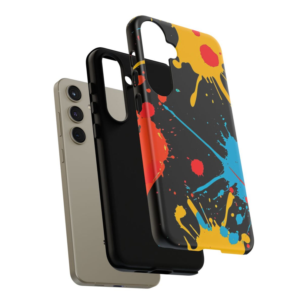 Dit hoesje heeft een opvallend ontwerp met levendige verfspatten in geel, rood en blauw op een diepe zwarte achtergrond. De spatten verschillen in grootte en vorm, waardoor een dynamisch en energiek patroon ontstaat. Het stevige hoesje bestaat uit twee lagen, met een buitenkant van polycarbonaat en een TPU-voering voor extra bescherming en duurzaamheid. Het hoesje ondersteunt draadloos opladen en is bestand tegen weersinvloeden, zodat de kleuren langdurig mooi blijven.