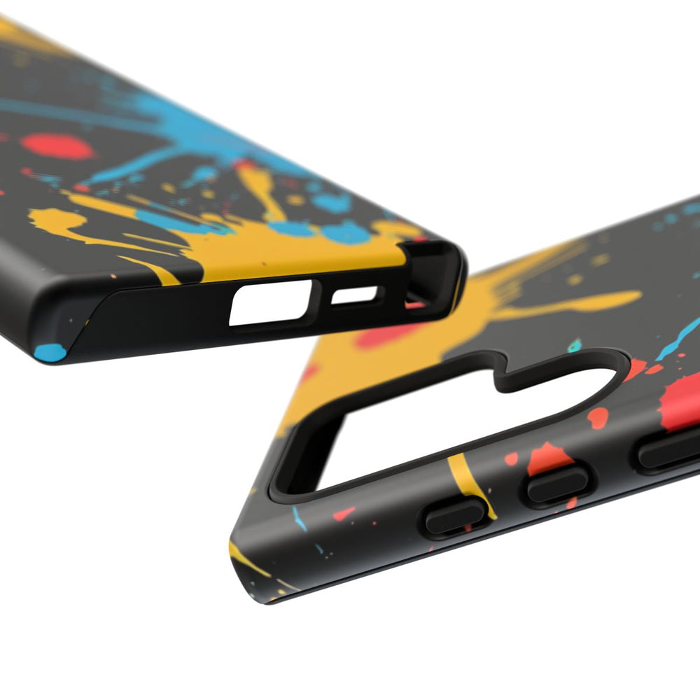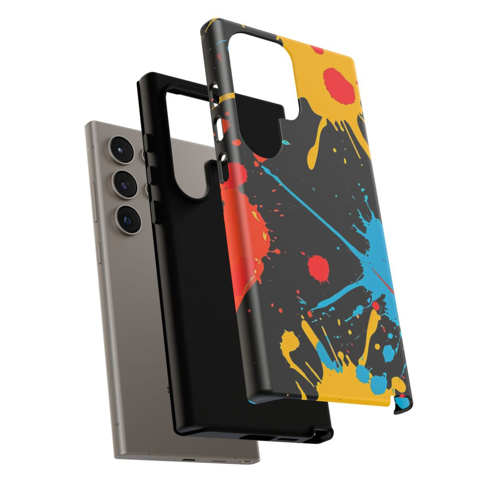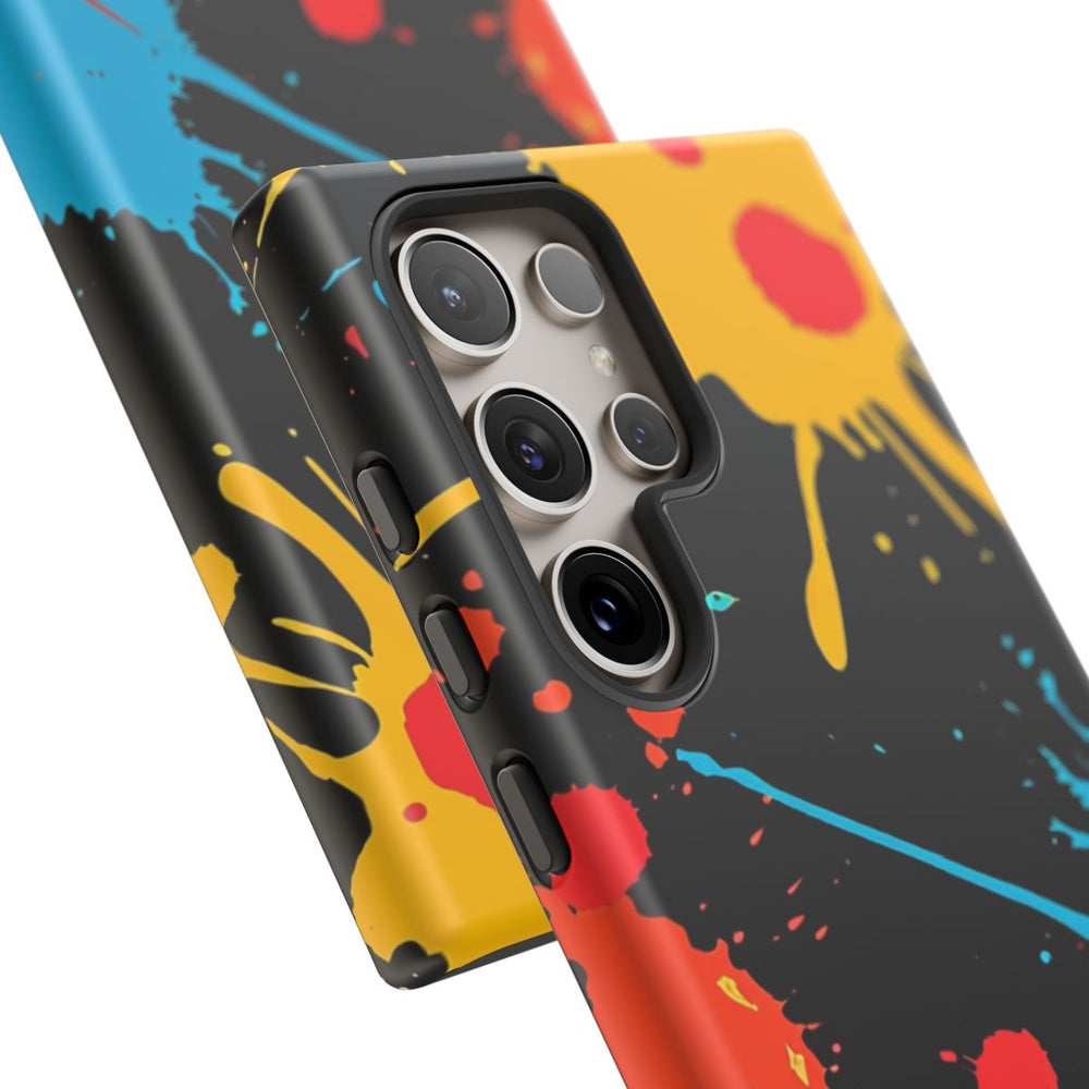 Dit hoesje heeft een opvallend ontwerp met levendige verfspatten in geel, rood en blauw op een diepe zwarte achtergrond. De spatten verschillen in grootte en vorm, waardoor een dynamisch en energiek patroon ontstaat. Het stevige hoesje bestaat uit twee lagen, met een buitenkant van polycarbonaat en een TPU-voering voor extra bescherming en duurzaamheid. Het hoesje ondersteunt draadloos opladen en is bestand tegen weersinvloeden, zodat de kleuren langdurig mooi blijven.