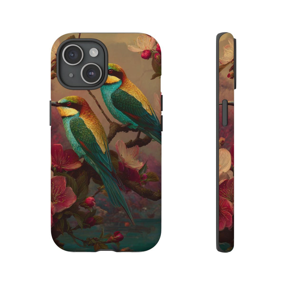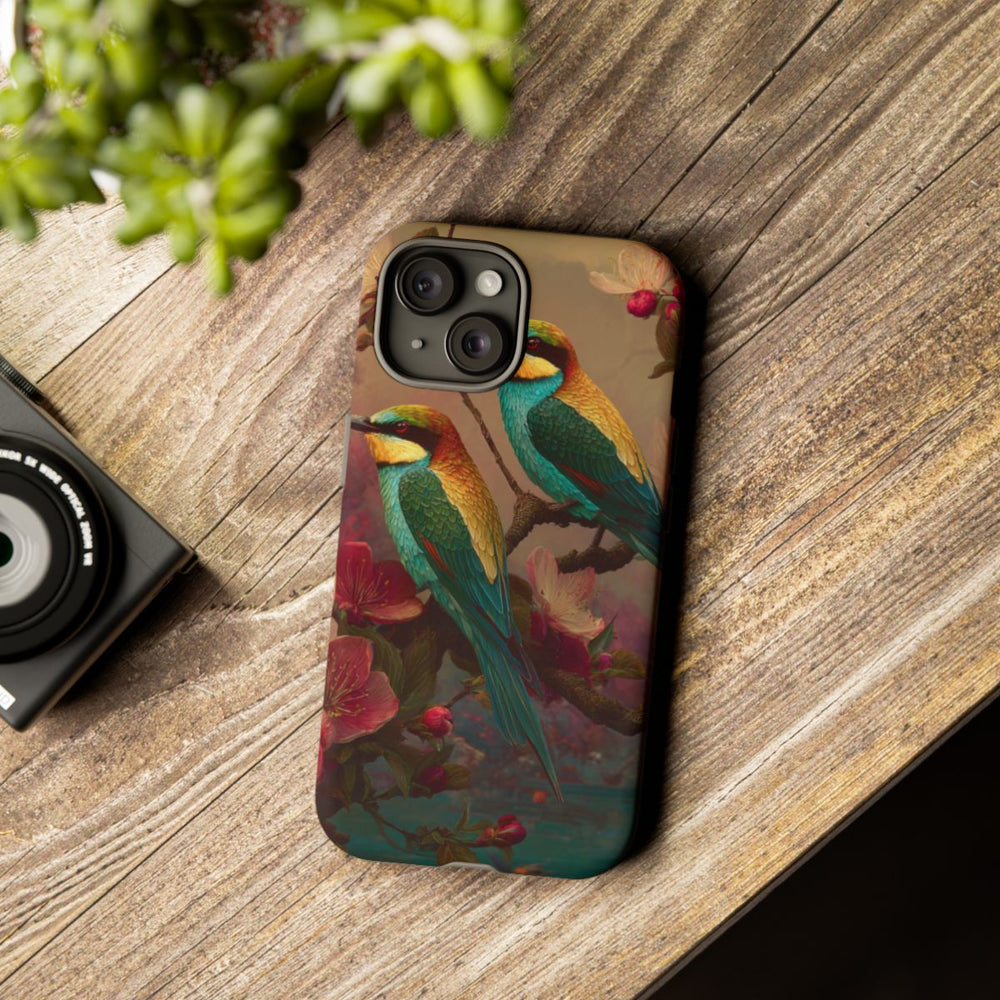 Dit telefoonhoesje is voorzien van een ontwerp met twee levendige vogels die op een tak vol roze en witte bloesems zitten. De vogels hebben opvallende kleuren zoals turquoise, geel en groen, met fraai gedetailleerde veren. Op de achtergrond is een zacht, ingetogen landschap te zien met bomen en water, wat extra diepte geeft aan het geheel. Het hoesje bestaat uit twee lagen van polycarbonaat en TPU, heeft een matte afwerking en is ontworpen voor optimale bescherming en duurzaamheid. Daarnaast ondersteunt het hoesje draadloos opladen.