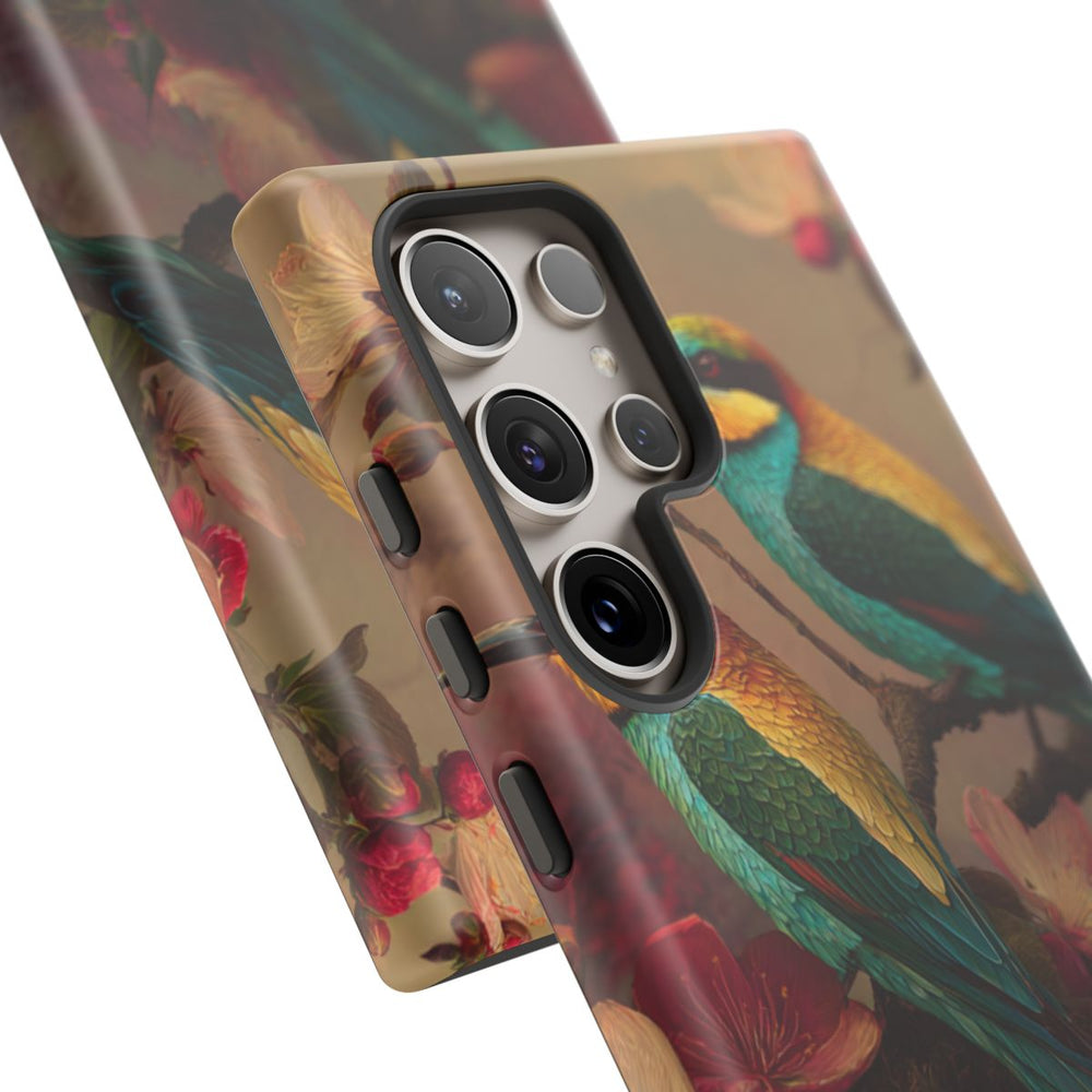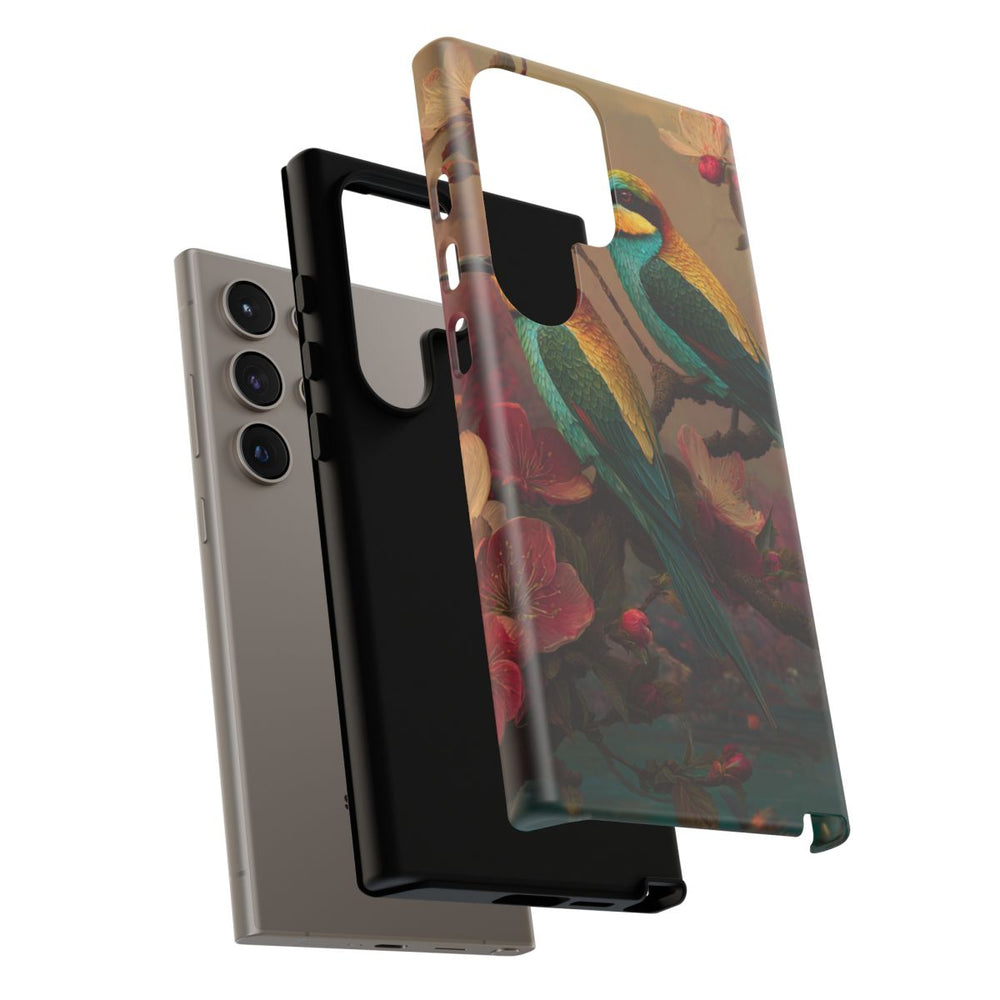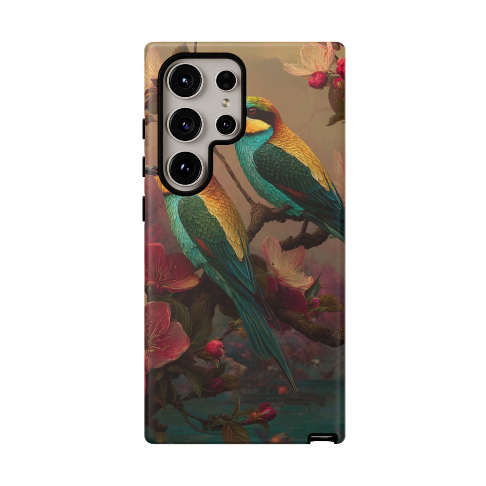 Dit telefoonhoesje is voorzien van een ontwerp met twee levendige vogels die op een tak vol roze en witte bloesems zitten. De vogels hebben opvallende kleuren zoals turquoise, geel en groen, met fraai gedetailleerde veren. Op de achtergrond is een zacht, ingetogen landschap te zien met bomen en water, wat extra diepte geeft aan het geheel. Het hoesje bestaat uit twee lagen van polycarbonaat en TPU, heeft een matte afwerking en is ontworpen voor optimale bescherming en duurzaamheid. Daarnaast ondersteunt het hoesje draadloos opladen.