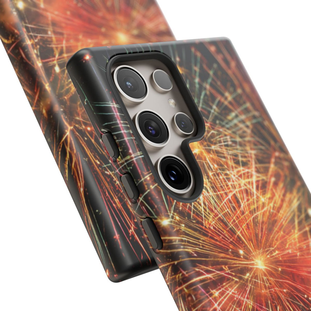 Dit hoesje is voorzien van een levendige afbeelding van vuurwerk dat uitbarst tegen een zwarte nachtelijke hemel. Heldere strepen in rood, oranje, geel, groen en blauw stralen vanuit verschillende explosiepunten, wat zorgt voor een dynamisch en feestelijk geheel. De vuurpijlen zijn gedetailleerd met fonkelende uiteinden en lichtgevende kernen, waardoor de energie en sfeer van een nachtelijk feest prachtig worden weergegeven. Het hoesje bestaat uit twee lagen: een stevige polycarbonaat buitenkant en een TPU binnenzijde voor extra bescherming en duurzaamheid. Geschikt voor draadloos opladen en uitstekend bestand tegen weersinvloeden, zodat het hoesje langdurig mooi blijft.