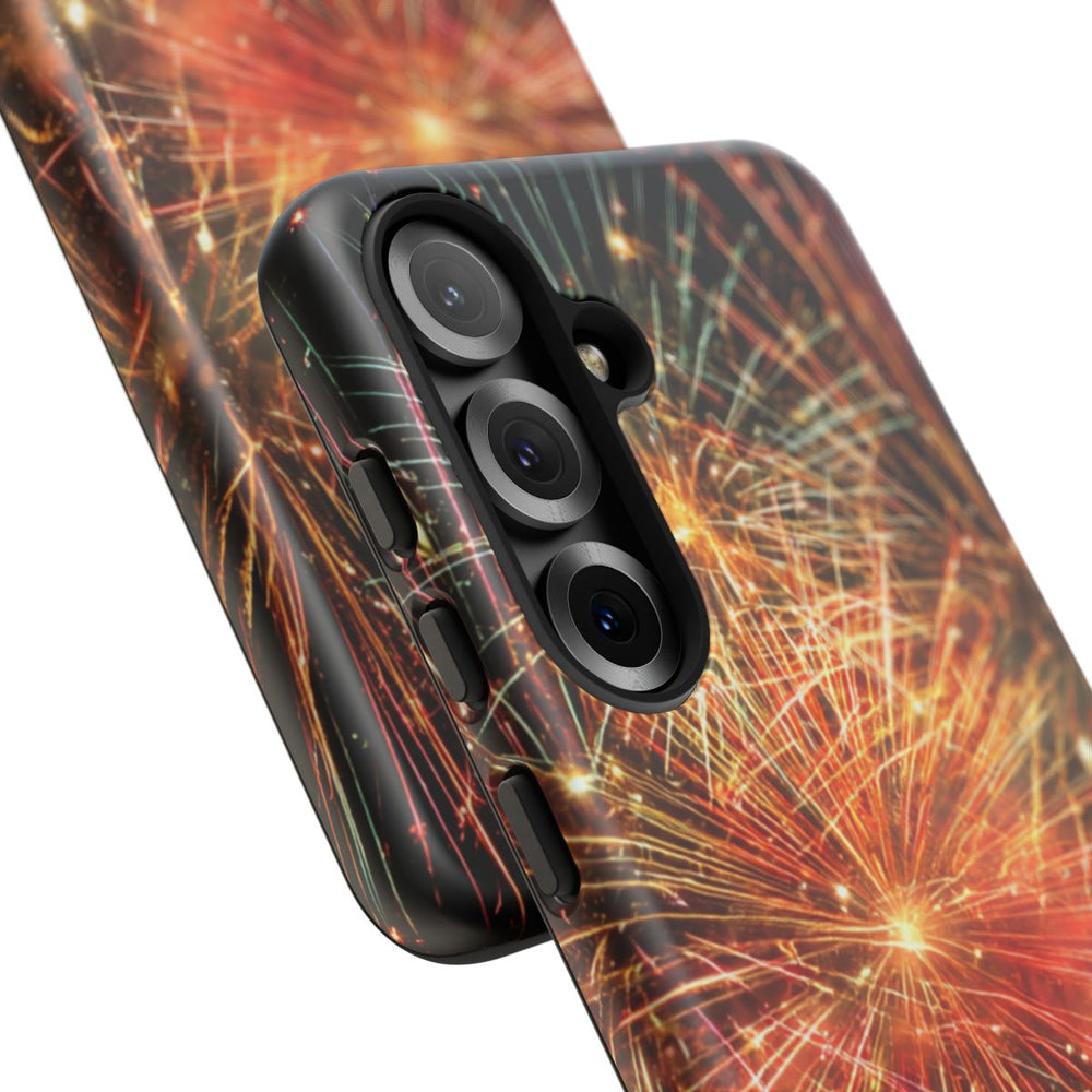 Dit hoesje is voorzien van een levendige afbeelding van vuurwerk dat uitbarst tegen een zwarte nachtelijke hemel. Heldere strepen in rood, oranje, geel, groen en blauw stralen vanuit verschillende explosiepunten, wat zorgt voor een dynamisch en feestelijk geheel. De vuurpijlen zijn gedetailleerd met fonkelende uiteinden en lichtgevende kernen, waardoor de energie en sfeer van een nachtelijk feest prachtig worden weergegeven. Het hoesje bestaat uit twee lagen: een stevige polycarbonaat buitenkant en een TPU binnenzijde voor extra bescherming en duurzaamheid. Geschikt voor draadloos opladen en uitstekend bestand tegen weersinvloeden, zodat het hoesje langdurig mooi blijft.