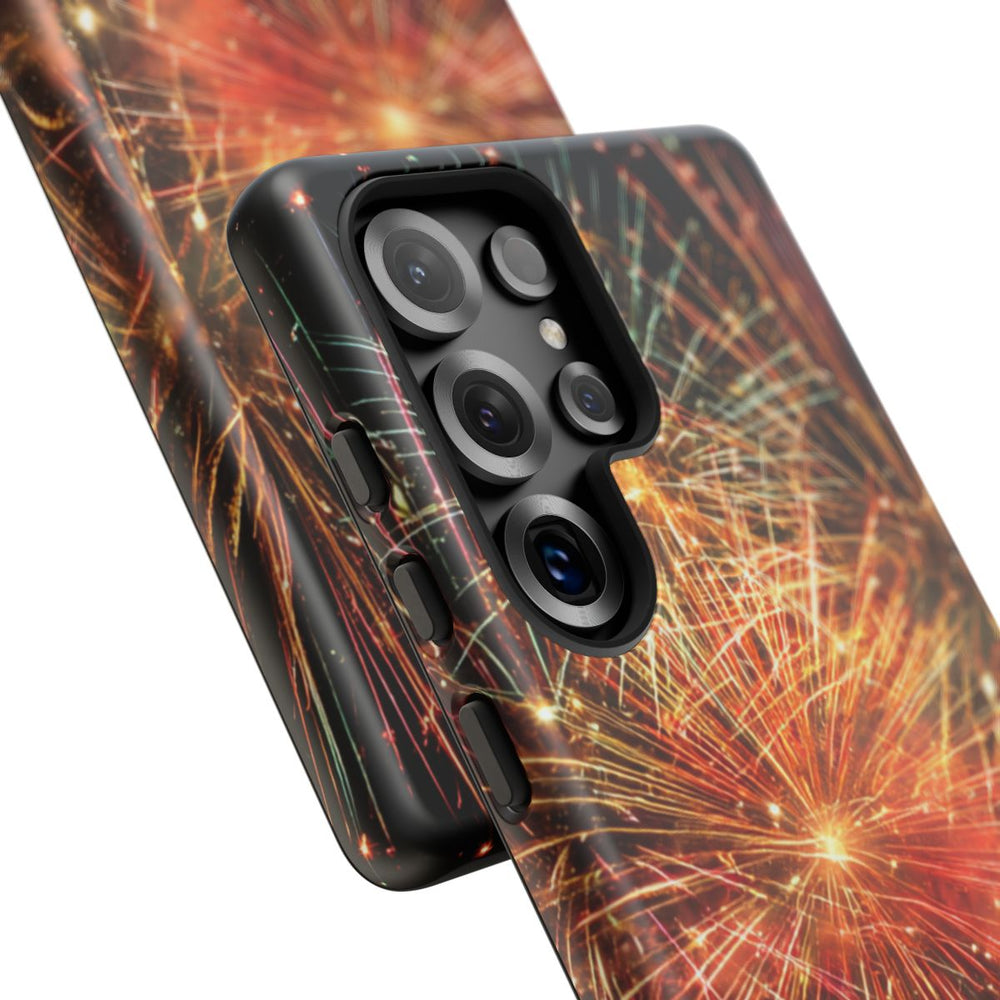 Dit hoesje is voorzien van een levendige afbeelding van vuurwerk dat uitbarst tegen een zwarte nachtelijke hemel. Heldere strepen in rood, oranje, geel, groen en blauw stralen vanuit verschillende explosiepunten, wat zorgt voor een dynamisch en feestelijk geheel. De vuurpijlen zijn gedetailleerd met fonkelende uiteinden en lichtgevende kernen, waardoor de energie en sfeer van een nachtelijk feest prachtig worden weergegeven. Het hoesje bestaat uit twee lagen: een stevige polycarbonaat buitenkant en een TPU binnenzijde voor extra bescherming en duurzaamheid. Geschikt voor draadloos opladen en uitstekend bestand tegen weersinvloeden, zodat het hoesje langdurig mooi blijft.