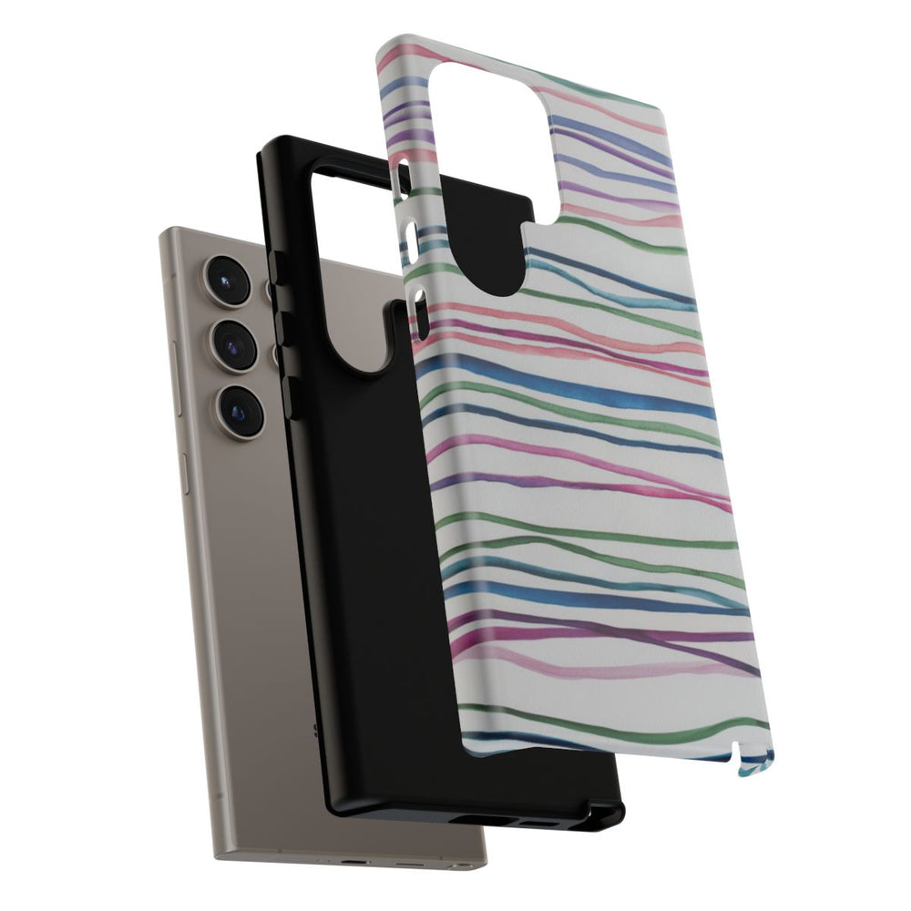 Dit hoesje heeft een speels ontwerp met meerdere horizontale waterverfstrepen in diverse kleuren, zoals blauw, groen, roze en paars, op een witte achtergrond. De strepen verschillen in dikte en hebben een handgeschilderde uitstraling met zachte randen. Het matte hoesje bestaat uit een stevige polycarbonaat buitenkant en een TPU-binnenlaag, wat zorgt voor dubbele bescherming. Dankzij het duurzame ontwerp is het hoesje bestand tegen dagelijks gebruik en geschikt voor draadloos opladen.