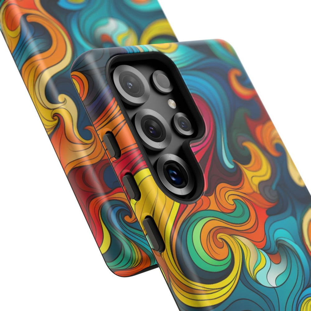 Dit hoesje heeft een opvallend ontwerp met wervelende patronen in levendige kleuren zoals rood, geel, blauw en groen. De abstracte vormen zorgen voor een dynamische en energieke uitstraling, perfect voor liefhebbers van gedurfde en kleurrijke designs. Het hoesje is voorzien van een dubbele laag voor extra bescherming en ondersteunt draadloos opladen. Ideaal voor wie zijn toestel een vrolijke en artistieke uitstraling wil geven.