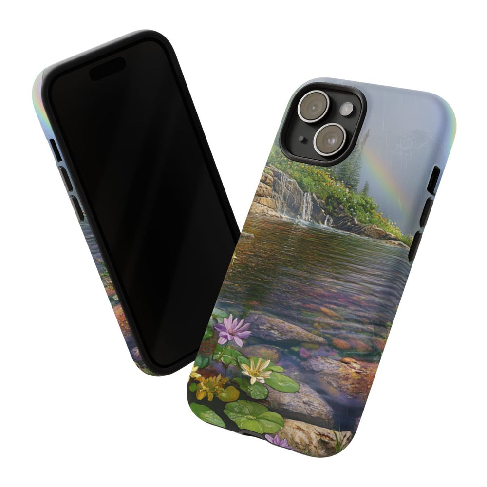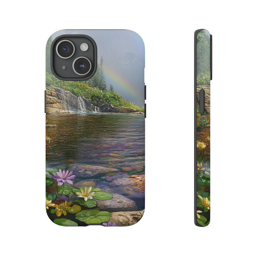 Dit ontwerp toont een rustgevend landschap met een levendige verzameling zomerbloemen in verschillende kleuren, zoals roze en geel, rondom een kalm wateroppervlak. Een waterval stroomt in het meer en een dubbele regenboog siert de nevelige lucht, wat zorgt voor een dromerige sfeer. Het weelderige groen en de kleurrijke bloemen benadrukken de natuurlijke schoonheid van het tafereel. Dit telefoonhoesje heeft een stevige polycarbonaat buitenkant en een TPU binnenlaag, waardoor je toestel goed beschermd is en draadloos opladen mogelijk blijft.