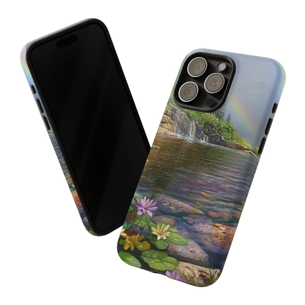 Dit hoesje toont een levendige scène met kleurrijke zomerbloemen rondom een rustig meer. Een zachte waterval stroomt in het water, terwijl weelderige groene bomen en bergen een prachtig decor vormen. Een regenboog boogt over de lucht en geeft het landschap een magisch tintje. De afbeelding vangt de schoonheid van de natuur, met bloemen in roze, geel en groen, wat zorgt voor een dromerige en romantische sfeer. Het hoesje is gemaakt van stevige materialen voor optimale bescherming.