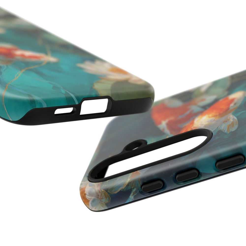 Dit hoesje toont sierlijke koi karpers die rustig tussen waterlelies zwemmen in een heldere, turquoise waterpartij. De levendige kleuren van de vissen komen prachtig naar voren dankzij het kristalheldere water. Subtiele leliebladeren en bloemen zorgen voor een harmonieuze en rustgevende uitstraling. Het hoesje is voorzien van een dubbele laag voor extra stevigheid en bescherming, past perfect om het toestel en ondersteunt draadloos opladen.