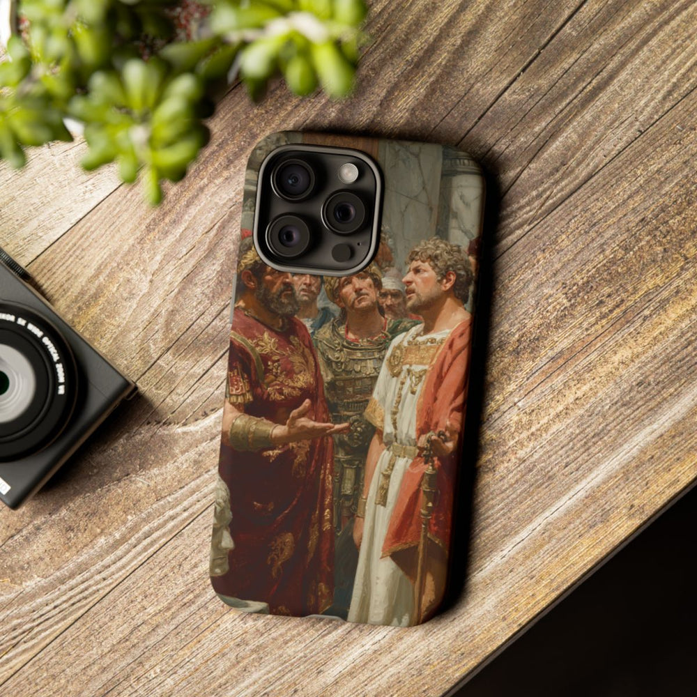 Dit hoesje toont een koninklijke hofscène met figuren in rijkversierde kleding. Eén persoon maakt een expressief gebaar, terwijl anderen verrast toekijken. De achtergrond bestaat uit klassieke architectuur en beelden, wat zorgt voor een historische sfeer. De rijke en gevarieerde kleuren versterken het dramatische karakter van het tafereel. Het hoesje is voorzien van een stevige polycarbonaat buitenkant en een TPU-binnenzijde, waardoor je toestel goed beschermd is en deze bijzondere afbeelding mooi tot zijn recht komt.